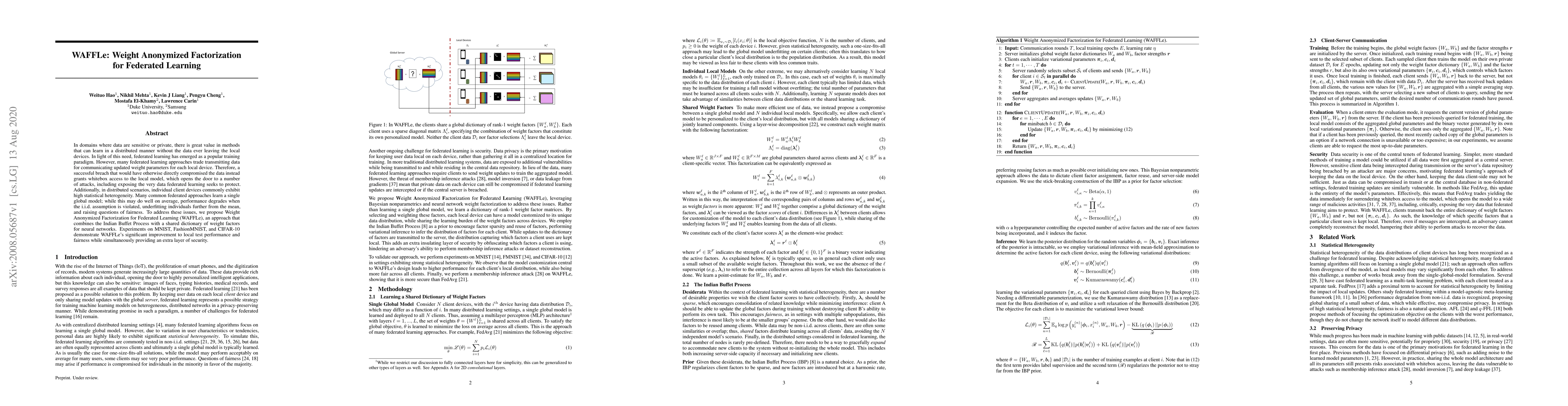 In domains where data are sensitive or private, there is great value in methods that can learn in a distributed manner without the data ever leaving the local devices. In light of this need, federated learning has emerged as a popular training paradigm. However, many federated learning approaches trade transmitting data for communicating updated weight parameters for each local device. Therefore, a successful breach that would have otherwise directly compromised the data instead grants whitebox access to the local model, which opens the door to a number of attacks, including exposing the very data federated learning seeks to protect. Additionally, in distributed scenarios, individual client devices commonly exhibit high statistical heterogeneity. Many common federated approaches learn a single global model; while this may do well on average, performance degrades when the i.i.d. assumption is violated, underfitting individuals further from the mean, and raising questions of fairness. To address these issues, we propose Weight Anonymized Factorization for Federated Learning (WAFFLe), an approach that combines the Indian Buffet Process with a shared dictionary of weight factors for neural networks. Experiments on MNIST, FashionMNIST, and CIFAR-10 demonstrate WAFFLe's significant improvement to local test performance and fairness while simultaneously providing an extra layer of security.