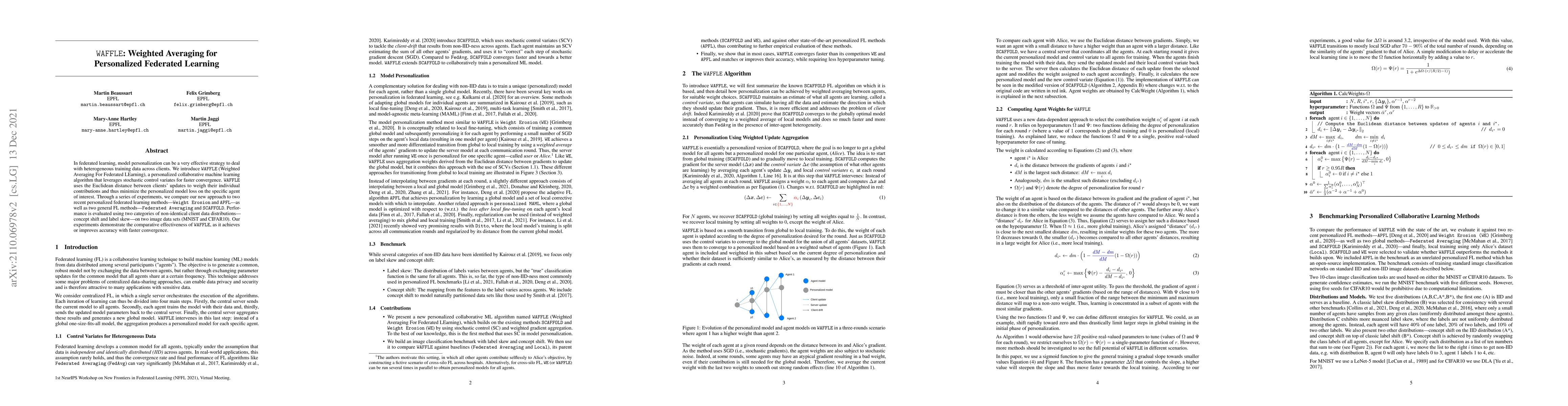 WAFFLE is a personalized federated learning algorithm that uses weighted averaging and stochastic control variates to achieve faster convergence and better accuracy. Experiments show that WAFFLE outperforms other personalized and general federated learning methods across various non-identical client data distributions.