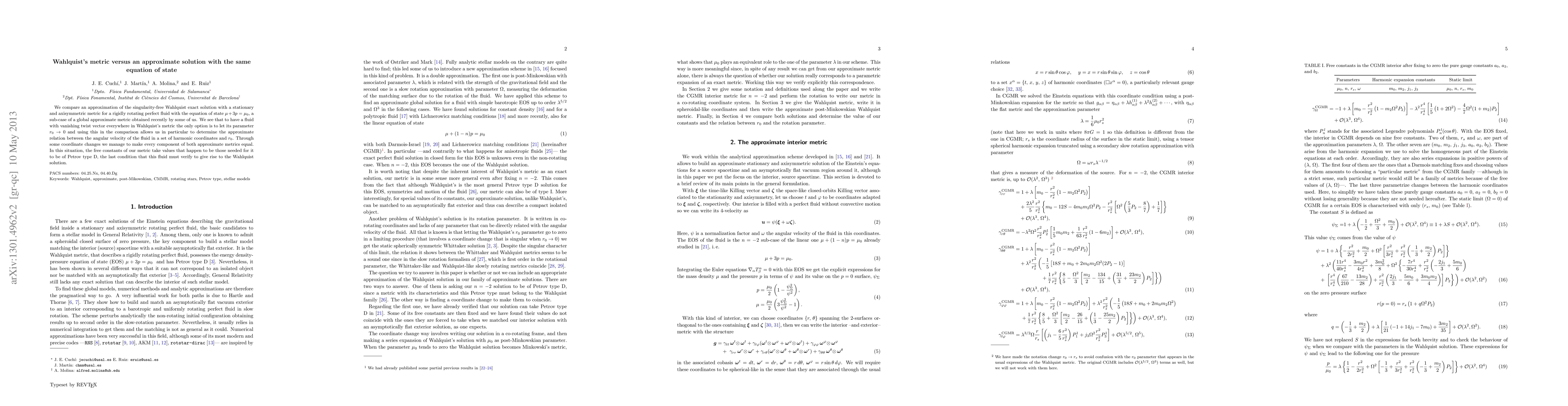 This paper compares an approximation of Wahlquist's singularity-free metric with a stationary, axisymmetric fluid metric sharing the same equation of state. By setting the parameter $r_0$ to zero, the researchers establish a relationship between the fluid's angular velocity and $r_0$. Through coordinate changes, they equate all components of both approximate metrics, determining that the free constants of their metric correspond to Petrov type D, a crucial condition for the fluid to yield the Wahlquist solution.