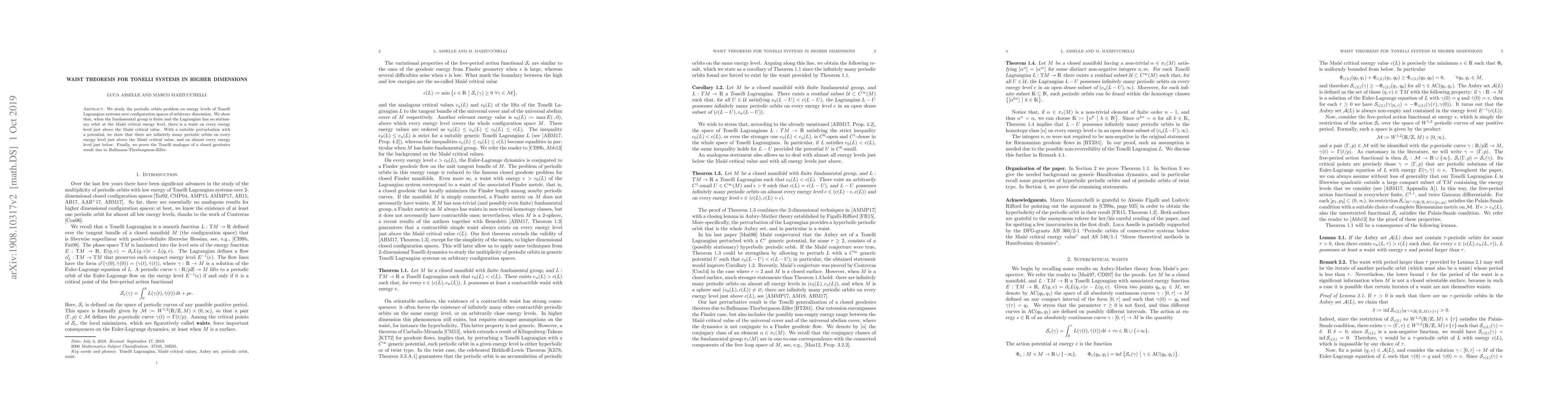 This research proves the existence of waists in Tonelli systems in higher dimensions, indicating multiple periodic orbits just above the Mañé critical energy level with suitable perturbations. It also establishes a Tonelli analogue of a closed geodesics result, providing insights into the periodic orbits problem for energy levels in various-dimensional configuration spaces.