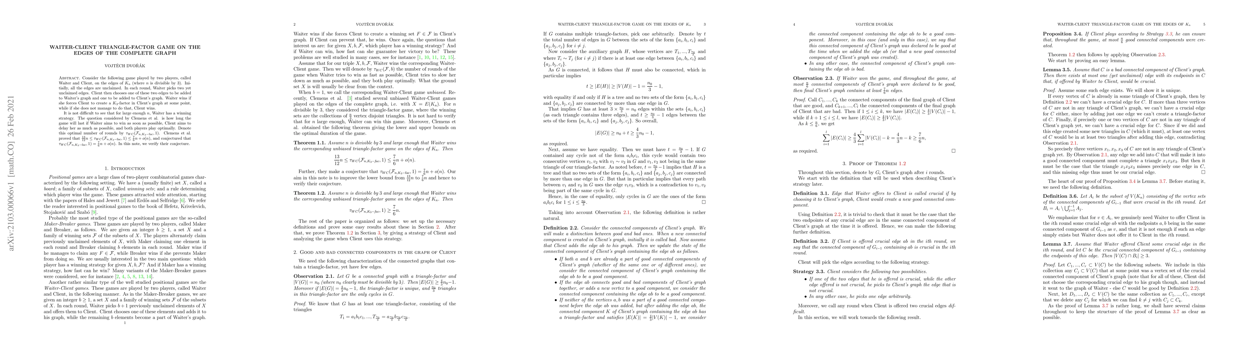 Consider the following game played by two players, called Waiter and Client, on the edges of $K_n$ (where $n$ is divisible by $3$). Initially, all the edges are unclaimed. In each round, Waiter picks two yet unclaimed edges. Client then chooses one of these two edges to be added to Waiter's graph and one to be added to Client's graph. Waiter wins if she forces Client to create a $K_3$-factor in Client's graph at some point, while if she does not manage to do that, Client wins. It is not difficult to see that for large enough $n$, Waiter has a winning strategy. The question considered by Clemens et al. is how long the game will last if Waiter aims to win as soon as possible, Client aims to delay her as much as possible, and both players play optimally. Denote this optimal number of rounds by $\tau_{WC}(\mathcal{F}_{n,K_3-\text{fac}},1 ) $. Clemens et al. proved that $\frac{13}{12}n \leq \tau_{WC}(\mathcal{F}_{n,K_3-\text{fac}},1 ) \leq \frac{7}{6}n+o(n) $, and conjectured that $\tau_{WC}(\mathcal{F}_{n,K_3-\text{fac}},1 ) = \frac{7}{6}n+o(n) $. In this note, we verify their conjecture.