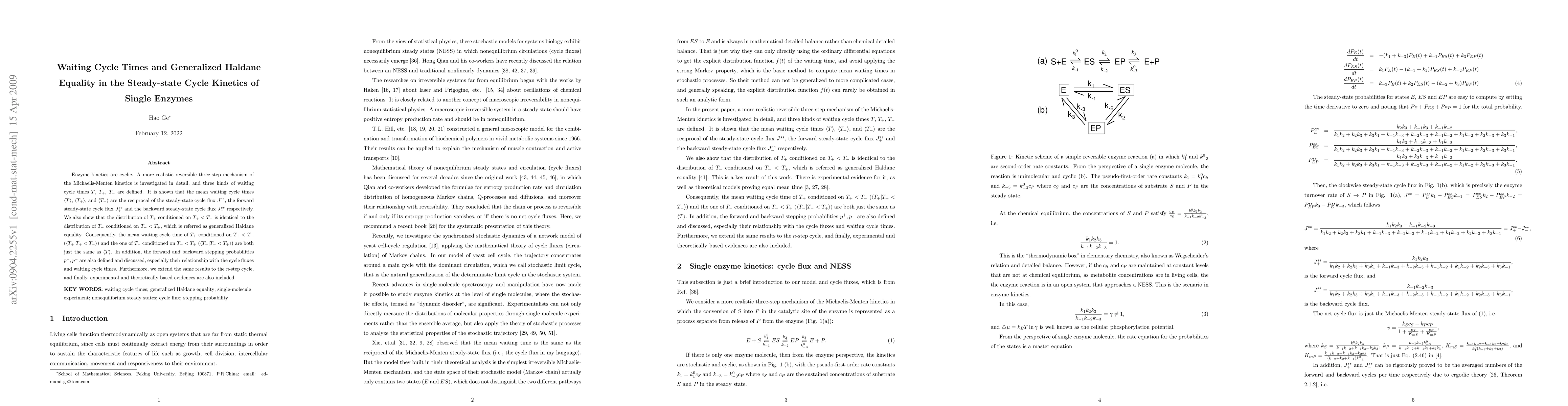 This paper investigates the reversible three-step mechanism of Michaelis-Menten kinetics, defining three waiting cycle times, and demonstrates that their mean values are reciprocals of respective steady-state fluxes. It establishes a generalized Haldane equality showing identical distributions for conditioned waiting times, and discusses the relationship between stepping probabilities and cycle fluxes, extending findings to $n$-step cycles.
