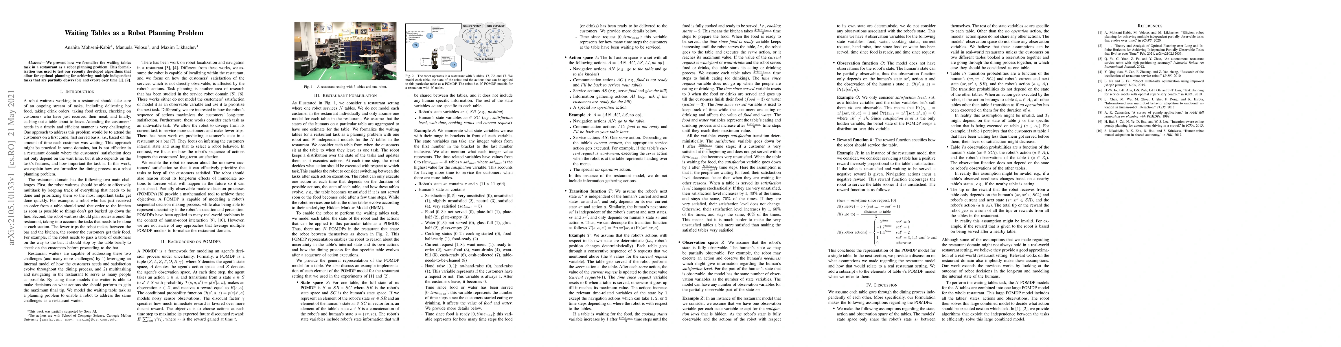We present how we formalize the waiting tables task in a restaurant as a robot planning problem. This formalization was used to test our recently developed algorithms that allow for optimal planning for achieving multiple independent tasks that are partially observable and evolve over time [1], [2].