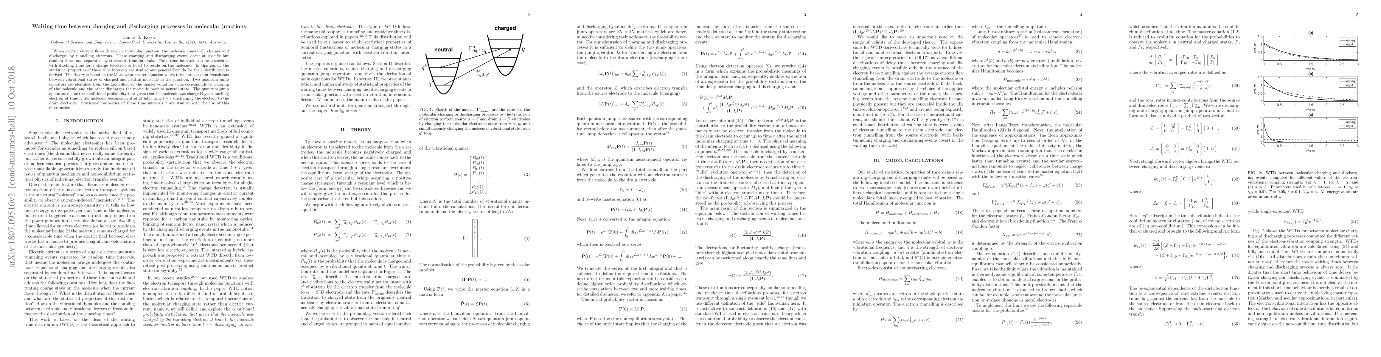 When electric current flows through a molecular junction, the molecule constantly charges and discharges by tunnelling electrons. These charging and discharging events occur at specific but random times and separated by stochastic time intervals. These time intervals can be associated with dwelling time for a charge (electron or hole) to reside on the molecule. In this paper, the statistical properties of these time intervals are studied and general formula for their distribution is derived. The theory is based on the Markovian master equation which takes into account transitions between vibrational states of charged and neutral molecule in the junction. Two quantum jump operators are identified from the Liouvillian of the master equation - one corresponds to charging of the molecule and the other discharges the molecule back to neutral state. The quantum jump operators define the conditional probability that given that the molecule was charged by a tunneling electron at time $t$, the molecule becomes neutral at later time $t+\tau$ discharging the electron to the drain electrode. Statistical properties of these time intervals $\tau$ are studied with the use of this distribution.