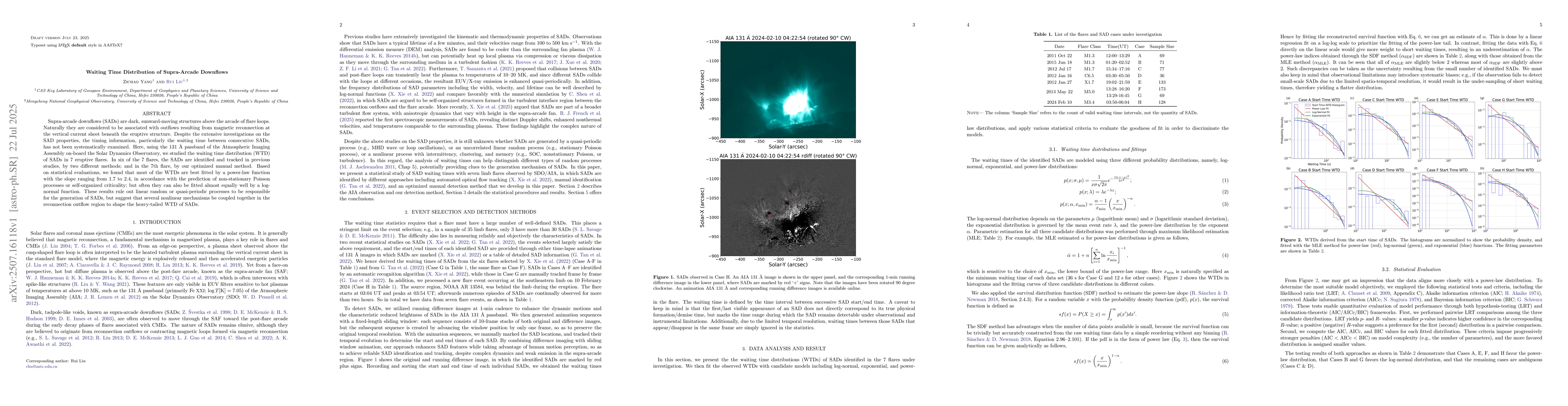 Supra-arcade downflows (SADs) are dark, sunward-moving structures above the arcade of flare loops. Naturally they are considered to be associated with outflows resulting from magnetic reconnection at the vertical current sheet beneath the eruptive structure. Despite the extensive investigations on the SAD properties, the timing information, particularly the waiting time between consecutive SADs, has not been systematically examined. Here, using the 131~{\AA} passband of the Atmospheric Imaging Assembly on-board the Solar Dynamics Observatory, we studied the waiting time distribution (WTD) of SADs in 7 eruptive flares. In six of the 7 flares, the SADs are identified and tracked in previous studies, by two different methods; and in the 7th flare, by our optimized manual method. Based on statistical evaluations, we found that most of the WTDs are best fitted by a power-law function with the slope ranging from 1.7 to 2.4, in accordance with the prediction of non-stationary Poisson processes or self-organized criticality; but often they can also be fitted almost equally well by a log-normal function. These results rule out linear random or quasi-periodic processes to be responsible for the generation of SADs, but suggest that several nonlinear mechanisms be coupled together in the reconnection outflow region to shape the heavy-tailed WTD of SADs.