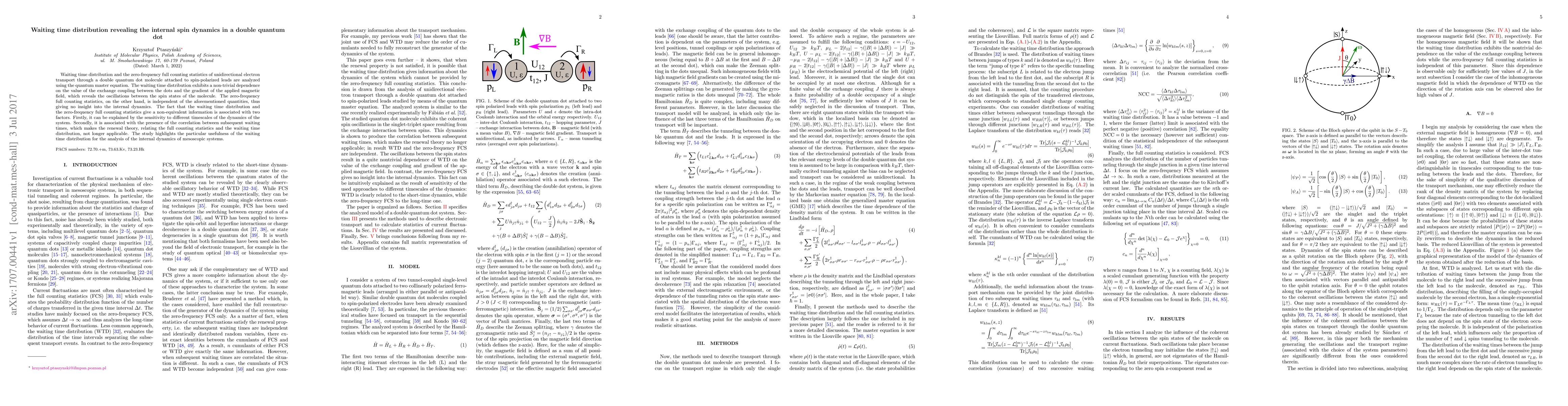 This paper analyzes the waiting time distribution in a double quantum dot system to reveal internal spin dynamics, showing its dependence on exchange coupling and magnetic field gradients. In contrast, zero-frequency full counting statistics provide no insight into these dynamics, highlighting the unique utility of waiting time distribution for understanding mesoscopic systems' internal dynamics.