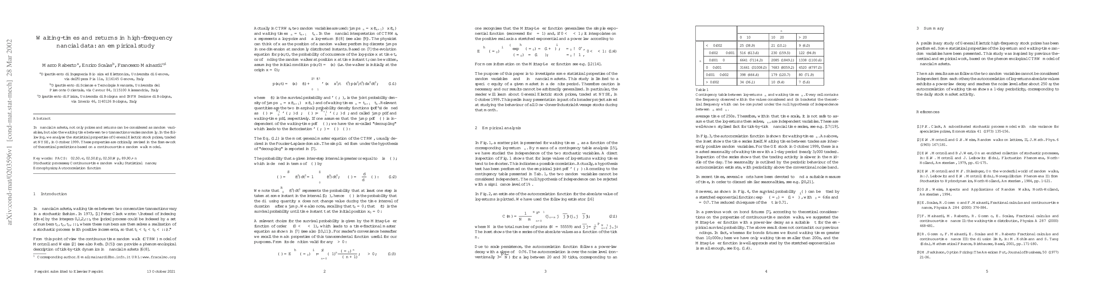 This paper investigates the statistical properties of waiting times between transactions in high-frequency financial data, using General Electric stock prices from October 1999. It compares these empirical findings with theoretical predictions from a continuous-time random walk model.