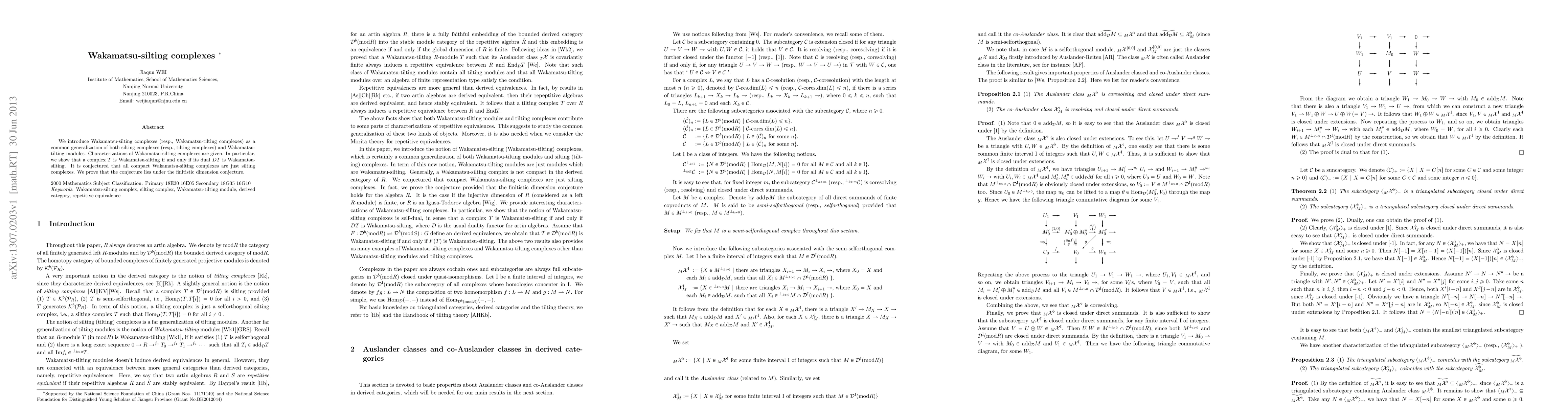 We introduce Wakamatsu-silting complexes (resp., Wakamatsu-tilting complexes) as a common generalization of both silting complexes (resp., tilting complexes) and Wakamatsu-tilting modules. Characterizations of Wakamatsu-silting complexes are given. In particular, we show that a complex $T$ is Wakamatsu-silting if and only if its dual $DT$ is Wakamatsu-silting. It is conjectured that all compact Wakamatsu-silting complexes are just silting complexes. We prove that the conjecture lies under the finitistic dimension conjecture.