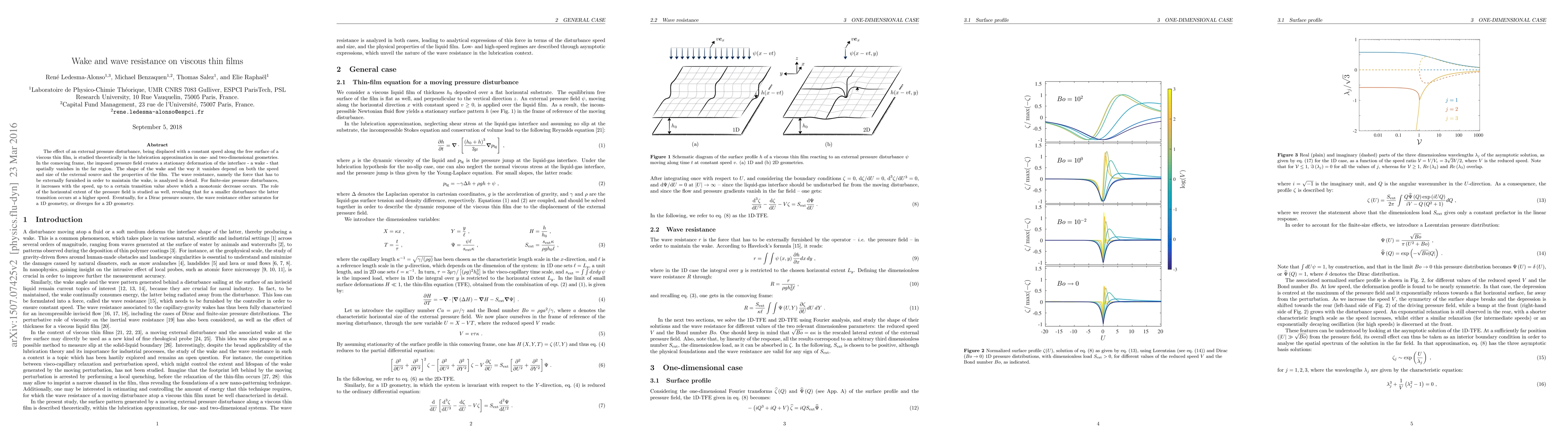 The effect of an external pressure disturbance, being displaced with a constant speed along the free surface of a viscous thin film, is studied theoretically in the lubrication approximation in one- and two-dimensional geometries. In the comoving frame, the imposed pressure field creates a stationary deformation of the interface - a wake - that spatially vanishes in the far region. The shape of the wake and the way it vanishes depend on both the speed and size of the external source and the properties of the film. The wave resistance, namely the force that has to be externally furnished in order to maintain the wake, is analysed in details. For finite-size pressure disturbances, it increases with the speed, up to a certain transition value above which a monotonic decrease occurs. The role of the horizontal extent of the pressure field is studied as well, revealing that for a smaller disturbance the latter transition occurs at higher speed. Eventually, for a Dirac pressure source, the wave resistance either saturates in a 1D geometry, or diverges in a 2D geometry.