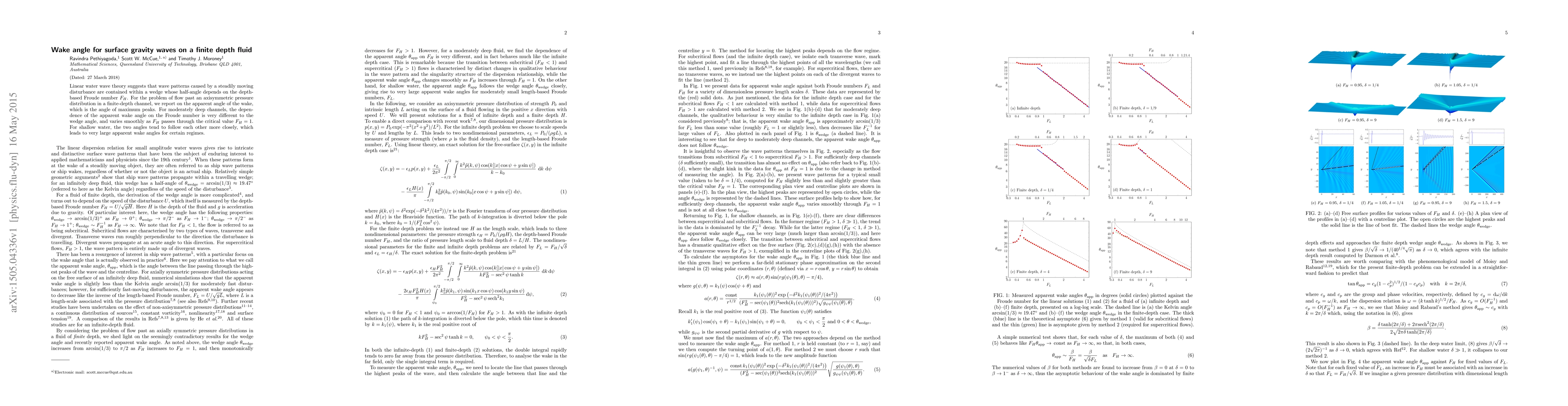 Researchers studied surface gravity waves on a finite depth fluid, finding that the apparent wake angle varies smoothly with the Froude number, differing from the predicted wedge angle for moderately deep channels.