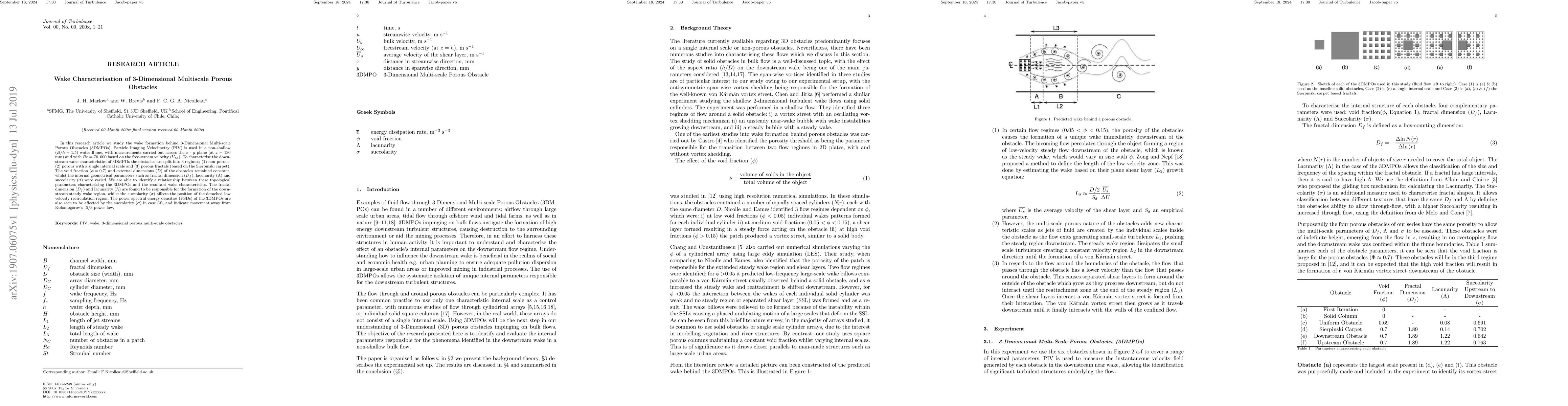 Researchers studied how 3D porous obstacles affect water flow behind them, finding that fractal dimensions and lacunarity control the wake shape, while succolarity affects the low-speed region near the obstacle.