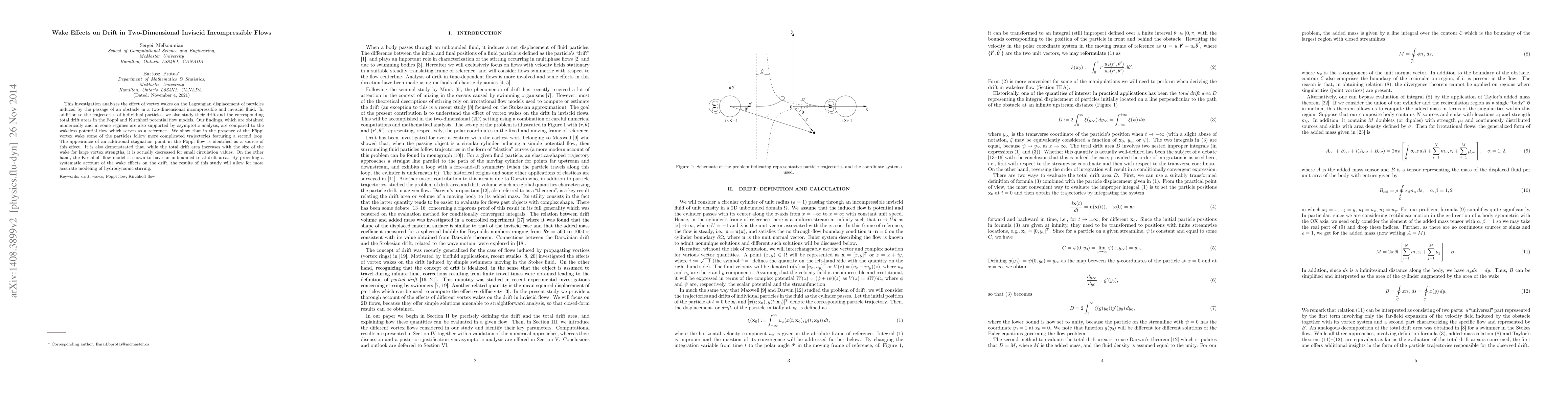 This investigation analyzes the effect of vortex wakes on the Lagrangian displacement of particles induced by the passage of an obstacle in a two-dimensional incompressible and inviscid fluid. In addition to the trajectories of individual particles, we also study their drift and the corresponding total drift areas in the F\"oppl and Kirchhoff potential flow models. Our findings, which are obtained numerically and in some regimes are also supported by asymptotic analysis, are compared to the wakeless potential flow which serves as a reference. We show that in the presence of the F\"oppl vortex wake some of the particles follow more complicated trajectories featuring a second loop. The appearance of an additional stagnation point in the F\"oppl flow is identified as a source of this effect. It is also demonstrated that, while the total drift area increases with the size of the wake for large vortex strengths, it is actually decreased for small circulation values. On the other hand, the Kirchhoff flow model is shown to have an unbounded total drift area. By providing a systematic account of the wake effects on the drift, the results of this study will allow for more accurate modeling of hydrodynamic stirring.