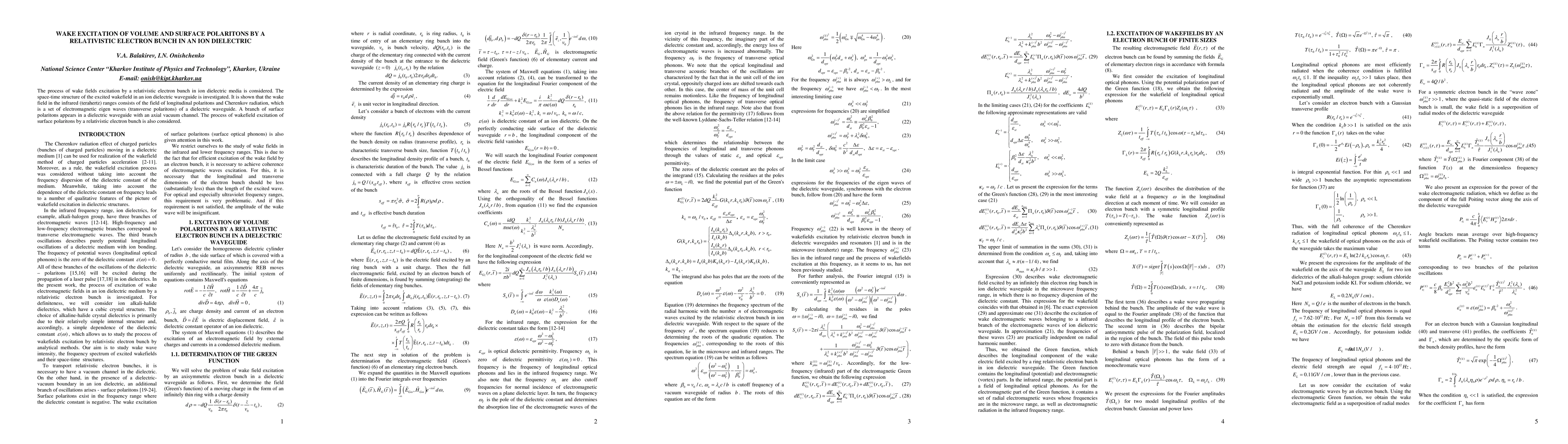 This paper investigates the wake fields excited by a relativistic electron bunch in ion dielectric media, revealing that the wake field includes longitudinal polaritons and Cherenkov radiation in the terahertz range. It also identifies a branch of surface polaritons in dielectric waveguides with an axial vacuum channel.