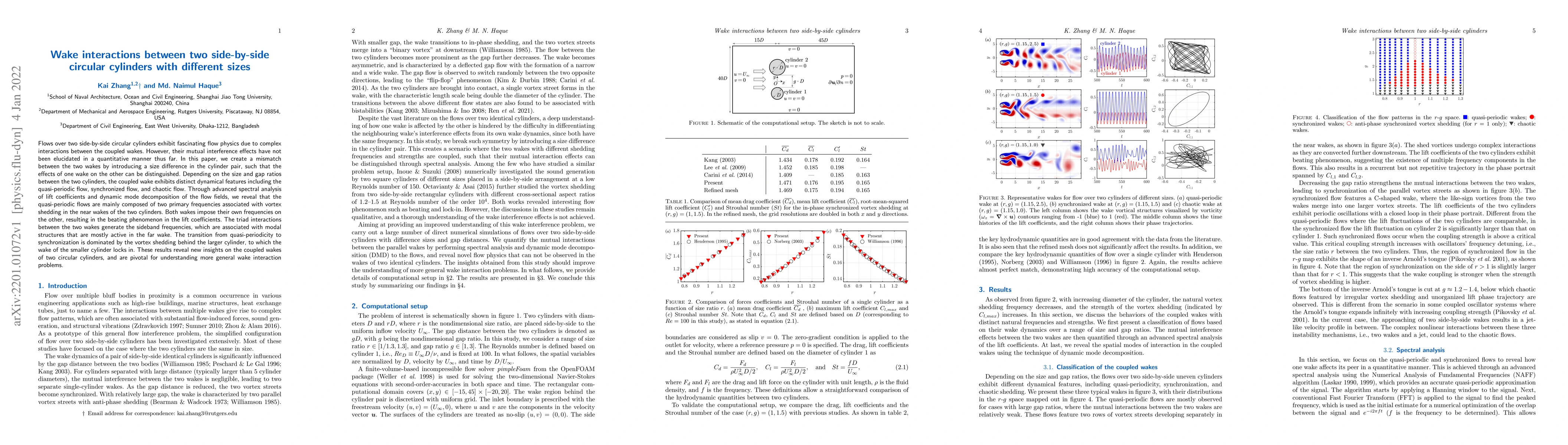 This paper investigates the complex interactions between the wakes of two side-by-side circular cylinders of different sizes, revealing distinct dynamical features such as quasi-periodic, synchronized, and chaotic flows. Advanced spectral analysis and dynamic mode decomposition show that vortex shedding frequencies from each cylinder influence the other, leading to phenomena like beating and sideband formation.