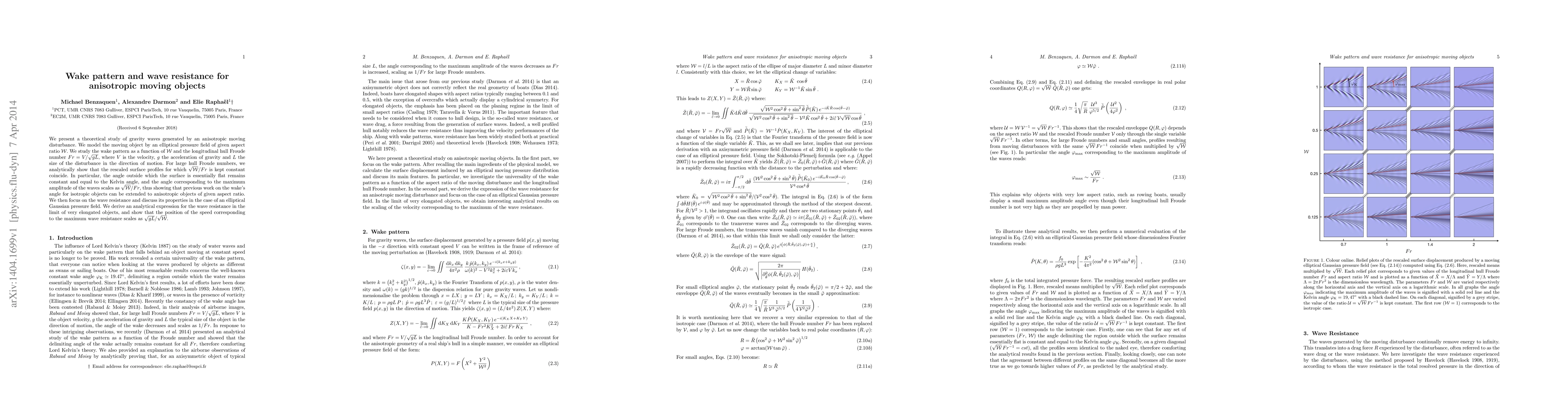 We present a theoretical study of gravity waves generated by an anisotropic moving disturbance. We model the moving object by an elliptical pressure field of given aspect ratio $\mathcal W$. We study the wake pattern as a function of $\mathcal W$ and the longitudinal hull Froude number $Fr = V/\sqrt{gL}$, where $V$ is the velocity, $g$ the acceleration of gravity and $L$ the size of the disturbance in the direction of motion. For large hull Froude numbers, we analytically show that the rescaled surface profiles for which $\sqrt{\mathcal W}/Fr$ is kept constant coincide. In particular, the angle outside which the surface is essentially flat remains constant and equal to the Kelvin angle, and the angle corresponding to the maximum amplitude of the waves scales as $\sqrt{\mathcal W}/Fr$, thus showing that previous work on the wake's angle for isotropic objects can be extended to anisotropic objects of given aspect ratio. We then focus on the wave resistance and discuss its properties in the case of an elliptical Gaussian pressure field. We derive an analytical expression for the wave resistance in the limit of very elongated objects, and show that the position of the speed corresponding to the maximum wave resistance scales as $\sqrt{gL}/\sqrt{\mathcal W}$.