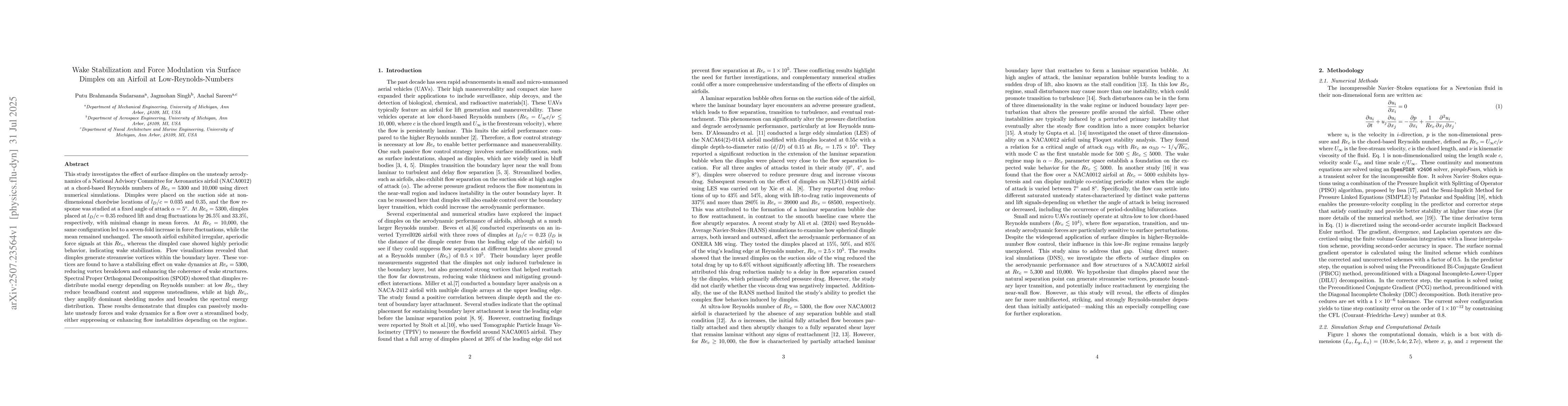 This study investigates the effect of surface dimples on the unsteady aerodynamics of a National Advisory Committee for Aeronautics airfoil (NACA0012) at a chord-based Reynolds numbers of $Re_c = 5300$ and $10{,}000$ using direct numerical simulations. Dimples were placed on the suction side at non-dimensional chordwise locations of $l_D/c = 0.035$ and $0.35$, and the flow response was studied at a fixed angle of attack $\alpha = 5^\circ$. At $Re_c = 5300$, dimples placed at $l_D/c = 0.35$ reduced lift and drag fluctuations by $26.5\%$ and $33.3\%$, respectively, with minimal change in mean forces. At $Re_c = 10{,}000$, the same configuration led to a seven-fold increase in force fluctuations, while the mean remained unchanged. The smooth airfoil exhibited irregular, aperiodic force signals at this $Re_c$, whereas the dimpled case showed highly periodic behavior, indicating wake stabilization. Flow visualizations revealed that dimples generate streamwise vortices within the boundary layer. These vortices are found to have a stabilizing effect on wake dynamics at $Re_c = 5300$, reducing vortex breakdown and enhancing the coherence of wake structures. Spectral Proper Orthogonal Decomposition (SPOD) showed that dimples redistribute modal energy depending on Reynolds number: at low $Re_c$, they reduce broadband content and suppress unsteadiness, while at high $Re_c$, they amplify dominant shedding modes and broaden the spectral energy distribution. These results demonstrate that dimples can passively modulate unsteady forces and wake dynamics for a flow over a streamlined body, either suppressing or enhancing flow instabilities depending on the regime.