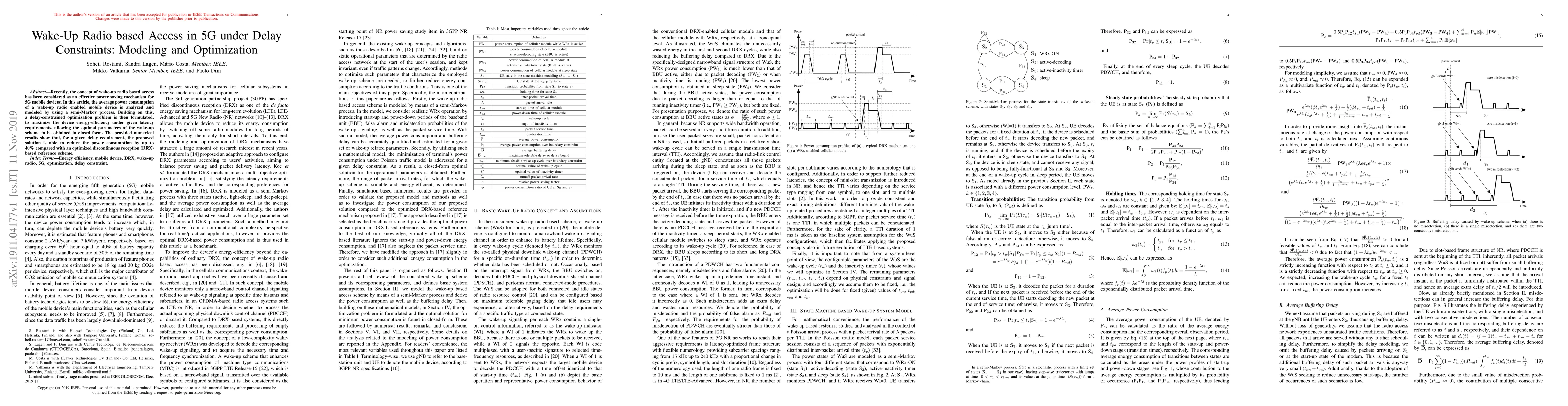 This paper models the average power consumption of 5G mobile devices using wake-up radio, employing a semi-Markov process. It formulates a delay-constrained optimization problem to maximize energy efficiency under latency constraints, achieving up to 40% power consumption reduction compared to a DRX-based reference scheme.