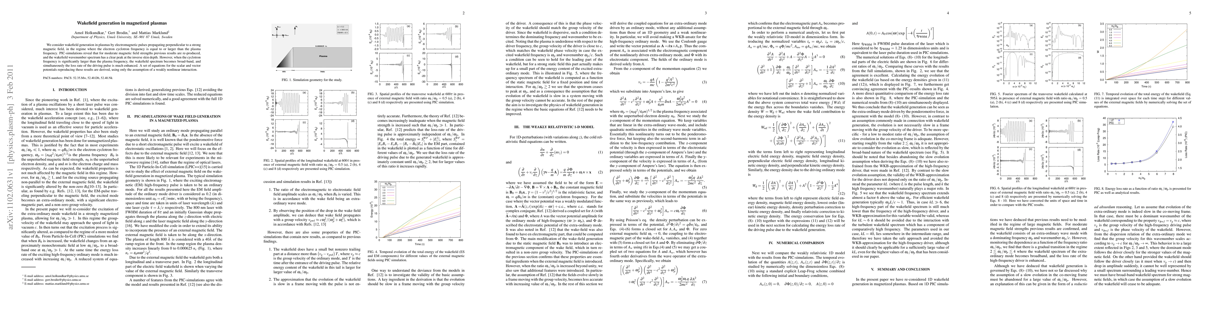 This paper investigates wakefield generation in magnetized plasmas using PIC simulations, finding that when the electron cyclotron frequency exceeds the plasma frequency, the wakefield spectrum becomes broad-band and pulse loss is significantly enhanced. Analytical equations for the potentials are derived under weakly nonlinear interaction assumptions.