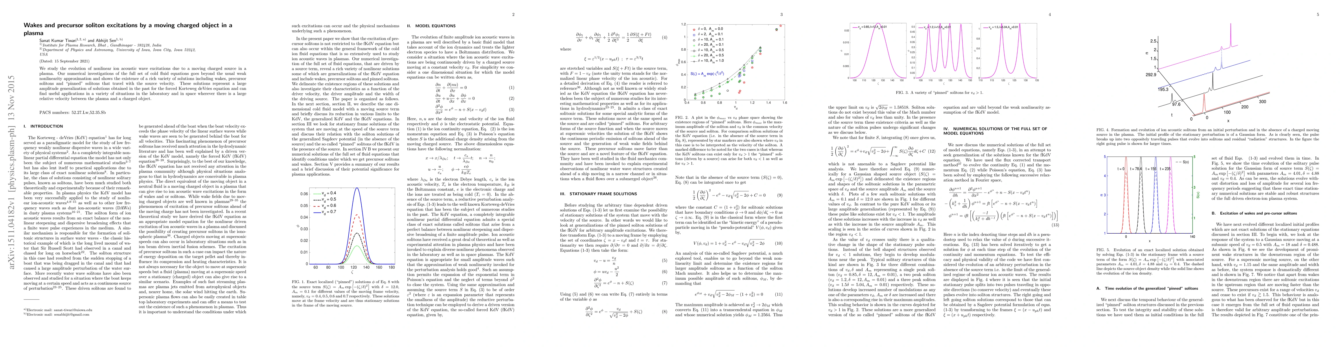 This paper explores the nonlinear ion acoustic wave excitations generated by a moving charged object in a plasma, revealing a variety of solutions including wakes and precursor solitons. The study goes beyond weak nonlinearity, providing insights applicable to laboratory and space environments with high-velocity plasma interactions.