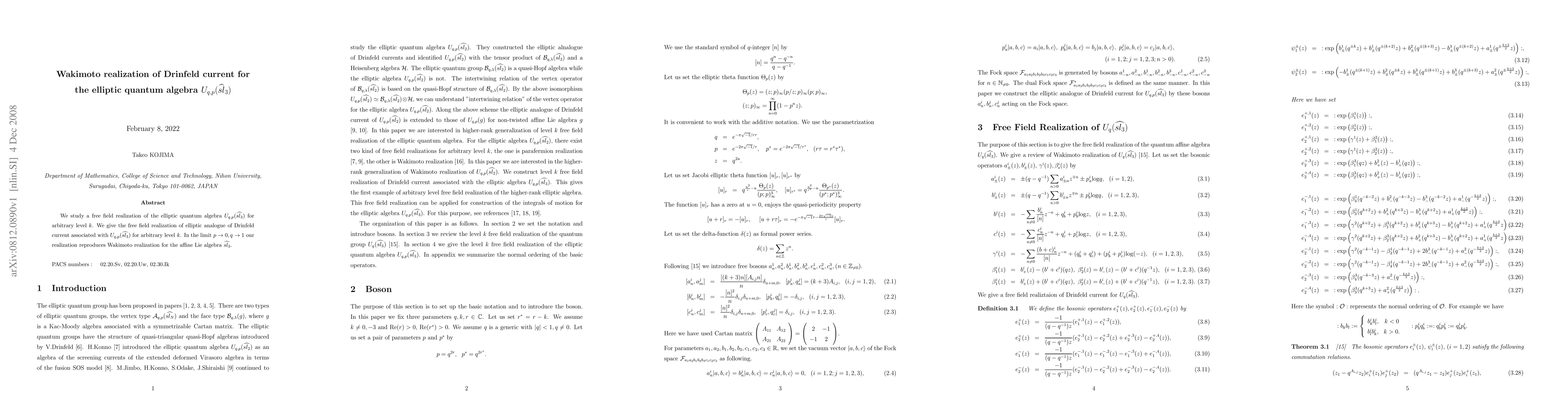This paper presents a free field realization of the elliptic quantum algebra $U_{q,p}(sl_3)$ for any level $k$, providing the elliptic analogue of Drinfeld current. It shows that in the limit $p \to 0, q \to 1$, the realization aligns with Wakimoto's construction for the affine Lie algebra $sl_3$.