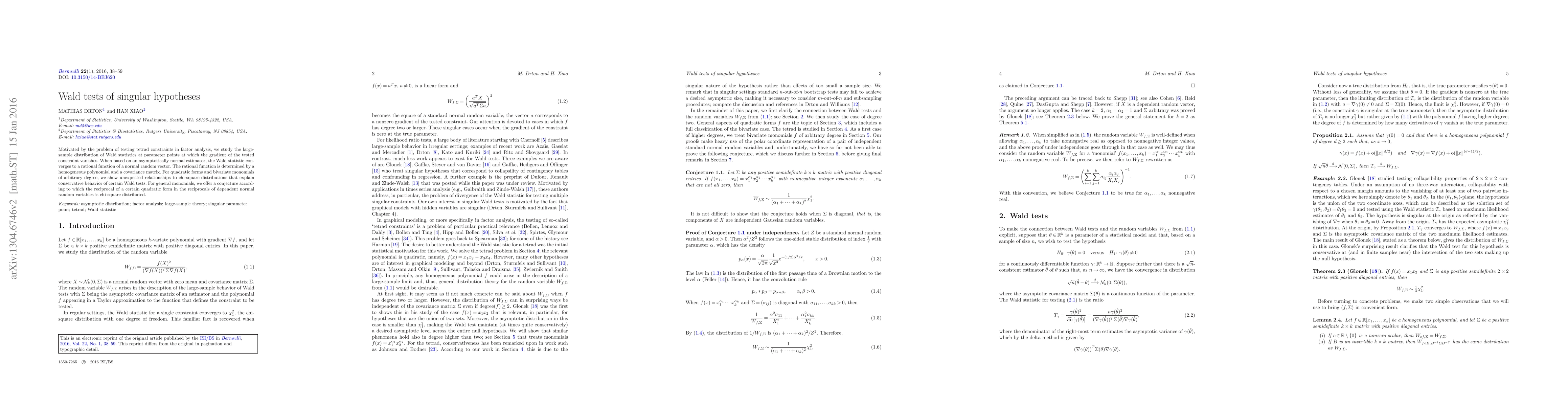 This paper investigates the large-sample distribution of Wald statistics for singular hypotheses, particularly in the context of testing tetrad constraints in factor analysis. It reveals unexpected chi-square distribution relationships for quadratic forms and bivariate monomials, explaining conservative behavior in certain Wald tests, and proposes a conjecture for general monomials.