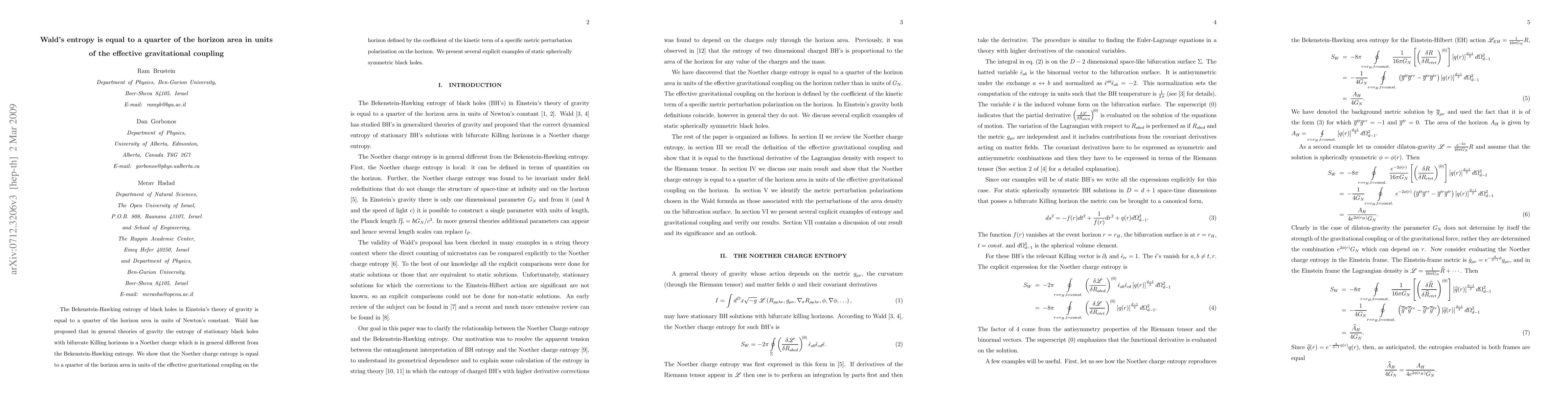 The Bekenstein-Hawking entropy of black holes in Einstein's theory of gravity is equal to a quarter of the horizon area in units of Newton's constant. Wald has proposed that in general theories of gravity the entropy of stationary black holes with bifurcate Killing horizons is a Noether charge which is in general different from the Bekenstein-Hawking entropy. We show that the Noether charge entropy is equal to a quarter of the horizon area in units of the effective gravitational coupling on the horizon defined by the coefficient of the kinetic term of specific graviton polarizations on the horizon. We present several explicit examples of static spherically symmetric black holes.