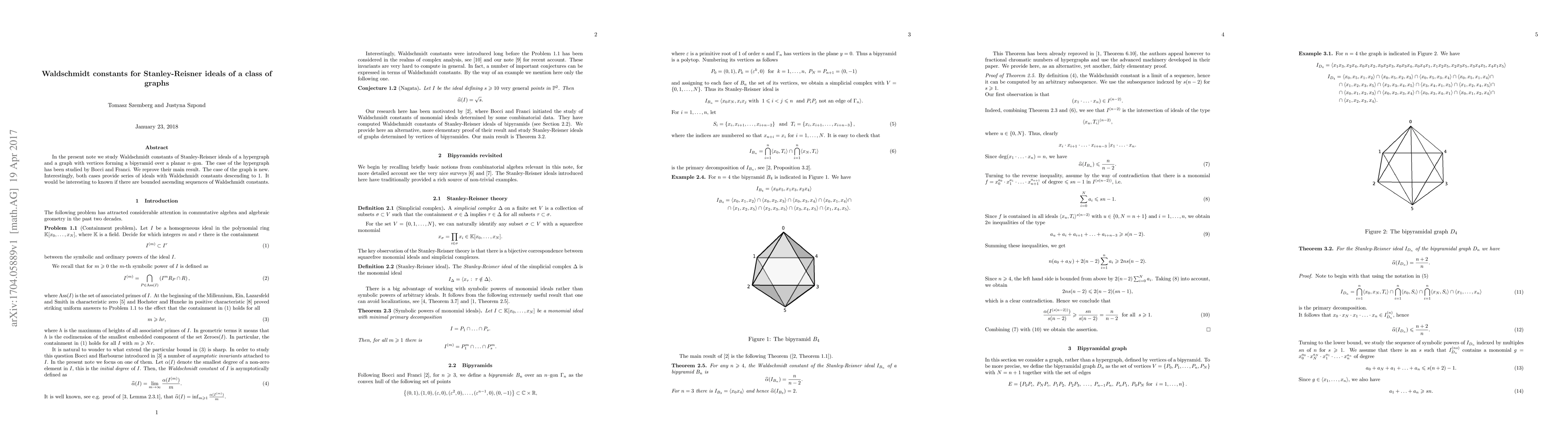 In the present note we study Waldschmidt constants of Stanley-Reisner ideals of a hypergraph and a graph with vertices forming a bipyramid over a planar n-gon. The case of the hypergraph has been studied by Bocci and Franci. We reprove their main result. The case of the graph is new. Interestingly, both cases provide series of ideals with Waldschmidt constants descending to 1. It would be interesting to known if there are bounded ascending sequences of Waldschmidt constants.