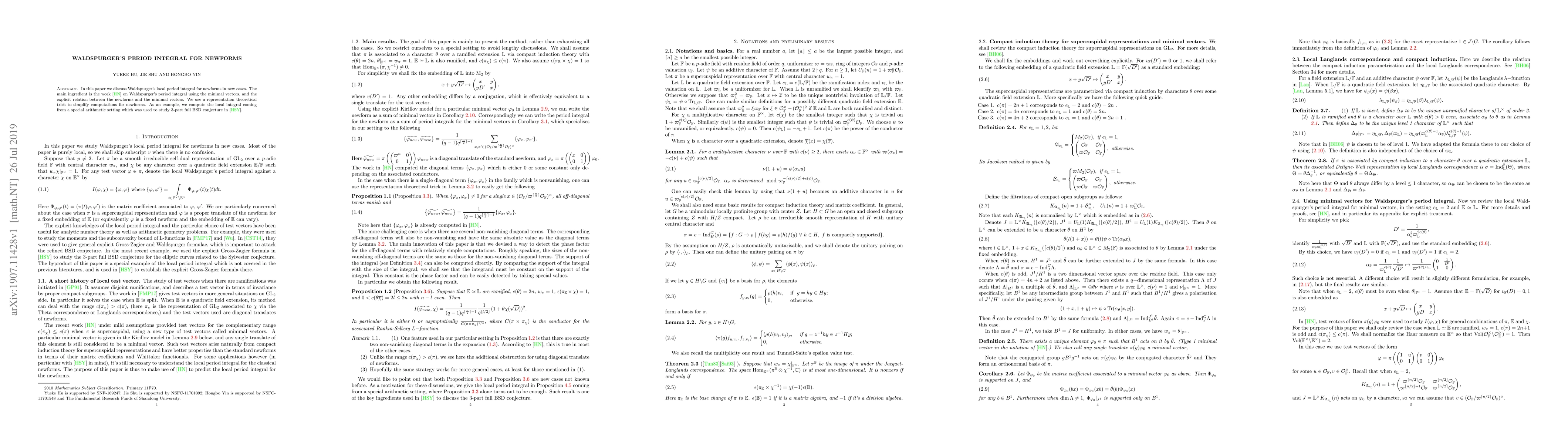 Researchers applied Waldspurger's period integral to newforms in new cases, simplifying computations using a representation theoretical trick. They provided an example in a special arithmetic setting that sheds light on the 3-part full BSD conjecture.