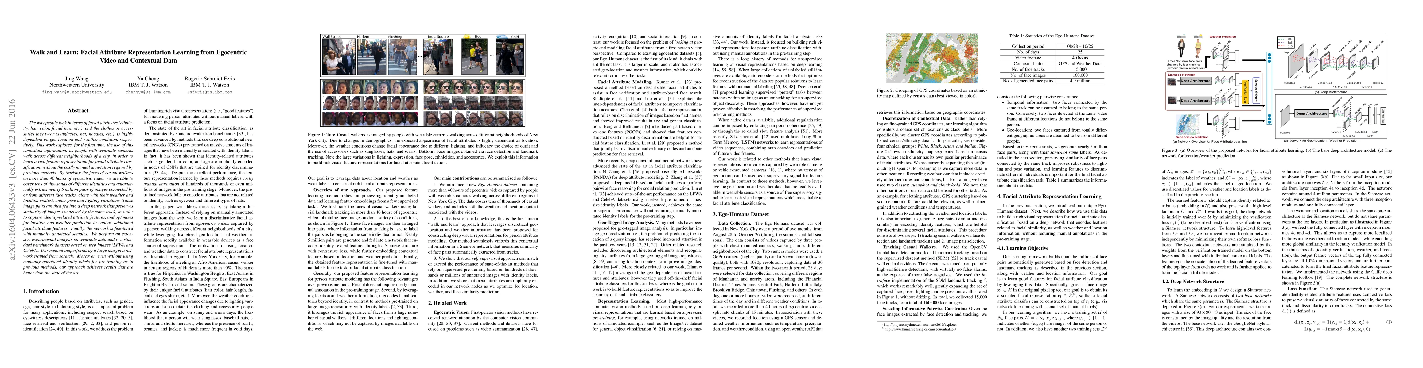 The way people look in terms of facial attributes (ethnicity, hair color, facial hair, etc.) and the clothes or accessories they wear (sunglasses, hat, hoodies, etc.) is highly dependent on geo-location and weather condition, respectively. This work explores, for the first time, the use of this contextual information, as people with wearable cameras walk across different neighborhoods of a city, in order to learn a rich feature representation for facial attribute classification, without the costly manual annotation required by previous methods. By tracking the faces of casual walkers on more than 40 hours of egocentric video, we are able to cover tens of thousands of different identities and automatically extract nearly 5 million pairs of images connected by or from different face tracks, along with their weather and location context, under pose and lighting variations. These image pairs are then fed into a deep network that preserves similarity of images connected by the same track, in order to capture identity-related attribute features, and optimizes for location and weather prediction to capture additional facial attribute features. Finally, the network is fine-tuned with manually annotated samples. We perform an extensive experimental analysis on wearable data and two standard benchmark datasets based on web images (LFWA and CelebA). Our method outperforms by a large margin a network trained from scratch. Moreover, even without using manually annotated identity labels for pre-training as in previous methods, our approach achieves results that are better than the state of the art.