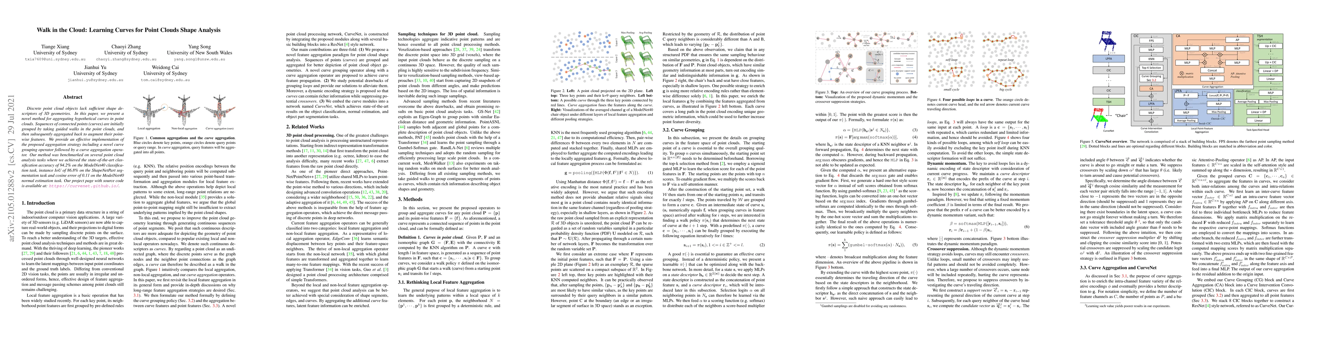 Discrete point cloud objects lack sufficient shape descriptors of 3D geometries. In this paper, we present a novel method for aggregating hypothetical curves in point clouds. Sequences of connected points (curves) are initially grouped by taking guided walks in the point clouds, and then subsequently aggregated back to augment their point-wise features. We provide an effective implementation of the proposed aggregation strategy including a novel curve grouping operator followed by a curve aggregation operator. Our method was benchmarked on several point cloud analysis tasks where we achieved the state-of-the-art classification accuracy of 94.2% on the ModelNet40 classification task, instance IoU of 86.8 on the ShapeNetPart segmentation task, and cosine error of 0.11 on the ModelNet40 normal estimation task.