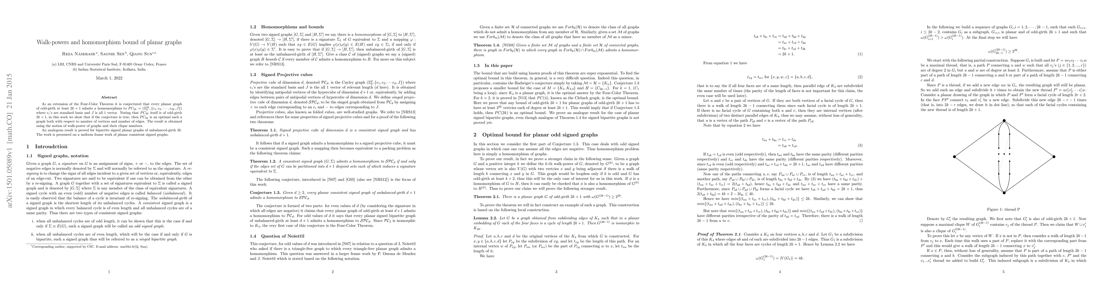 As an extension of the Four-Color Theorem it is conjectured that every planar graph of odd-girth at least $2k+1$ admits a homomorphism to $PC_{2k}=(\mathbb{Z}_2^{2k}, \{e_1, e_2, ...,e_{2k}, J\})$ where $e_i$'s are standard basis and $J$ is all 1 vector. Noting that $PC_{2k}$ itself is of odd-girth $2k+1$, in this work we show that if the conjecture is true, then $PC_{2k}$ is an optimal such a graph both with respect to number of vertices and number of edges. The result is obtained using the notion of walk-power of graphs and their clique numbers. An analogous result is proved for bipartite signed planar graphs of unbalanced-girth $2k$. The work is presented on a uniform frame work of planar consistent signed graphs.