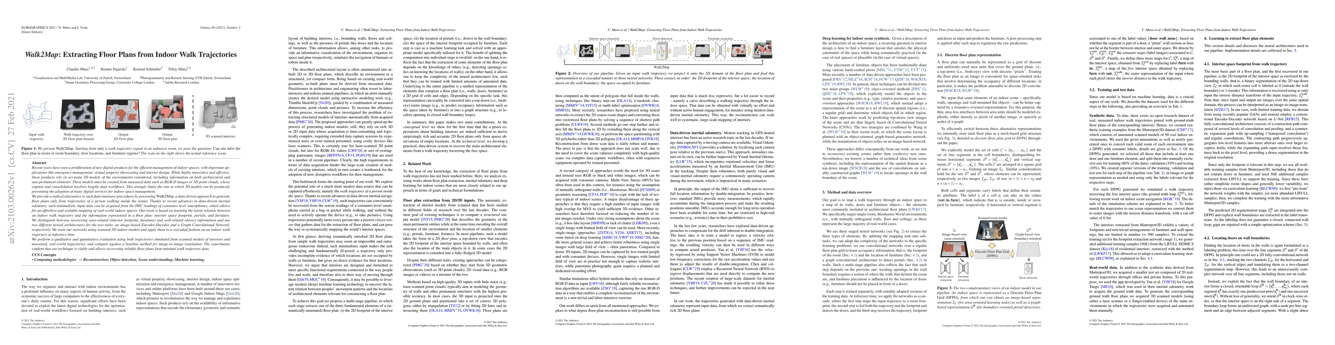Walk2Map presents a novel data-driven method to generate floor plans from indoor walk trajectories using consumer-level smartphone IMU readings, bypassing the need for extensive data workflows. The approach leverages neural networks to extract interior and wall-related information from walk data, demonstrating feasibility through qualitative and quantitative evaluations.