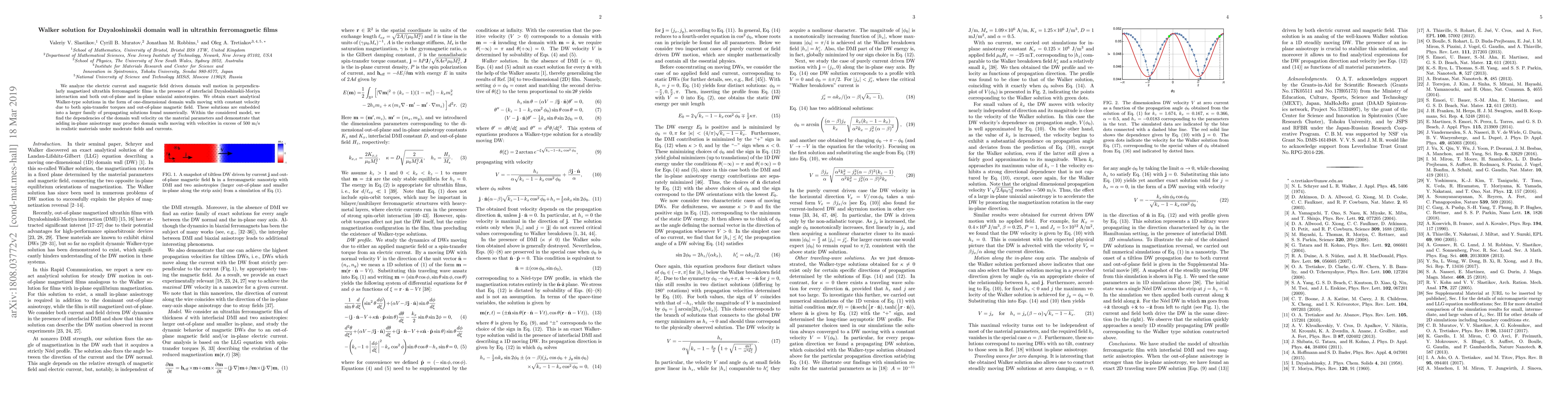 The research analyzes the motion of domain walls in ultrathin ferromagnetic films using exact analytical Walker-type solutions and numerical methods, considering interfacial Dzyaloshinskii-Moriya interaction and both out-of-plane and in-plane uniaxial anisotropies.