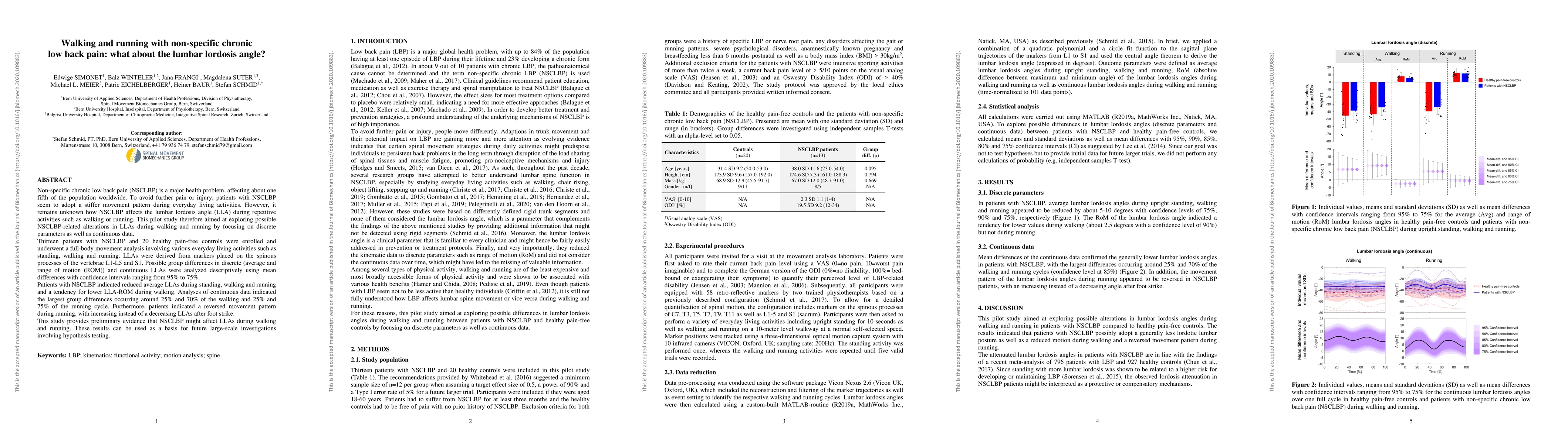 Non-specific chronic low back pain (NSCLBP) is a major health problem, affecting about one fifth of the population worldwide. To avoid further pain or injury, patients with NSCLBP seem to adopt a stiffer movement pattern during everyday living activities. However, it remains unknown how NSCLBP affects the lumbar lordosis angle (LLA) during repetitive activities such as walking or running. This pilot study therefore aimed at exploring possible NSCLBP-related alterations in LLAs during walking and running by focusing on discrete parameters as well as continuous data. Thirteen patients with NSCLBP and 20 healthy pain-free controls were enrolled and underwent a full-body movement analysis involving various everyday living activities such as standing, walking and running. LLAs were derived from markers placed on the spinous processes of the vertebrae L1-L5 and S1. Possible group differences in discrete (average and range of motion (ROM)) and continuous LLAs were analyzed descriptively using mean differences with confidence intervals ranging from 95% to 75%. Patients with NSCLBP indicated reduced average LLAs during standing, walking and running and a tendency for lower LLA-ROM during walking. Analyses of continuous data indicated the largest group differences occurring around 25% and 70% of the walking and 25% and 75% of the running cycle. Furthermore, patients indicated a reversed movement pattern during running, with increasing instead of a decreasing LLAs after foot strike. This study provides preliminary evidence that NSCLBP might affect LLAs during walking and running. These results can be used as a basis for future large-scale investigations involving hypothesis testing.