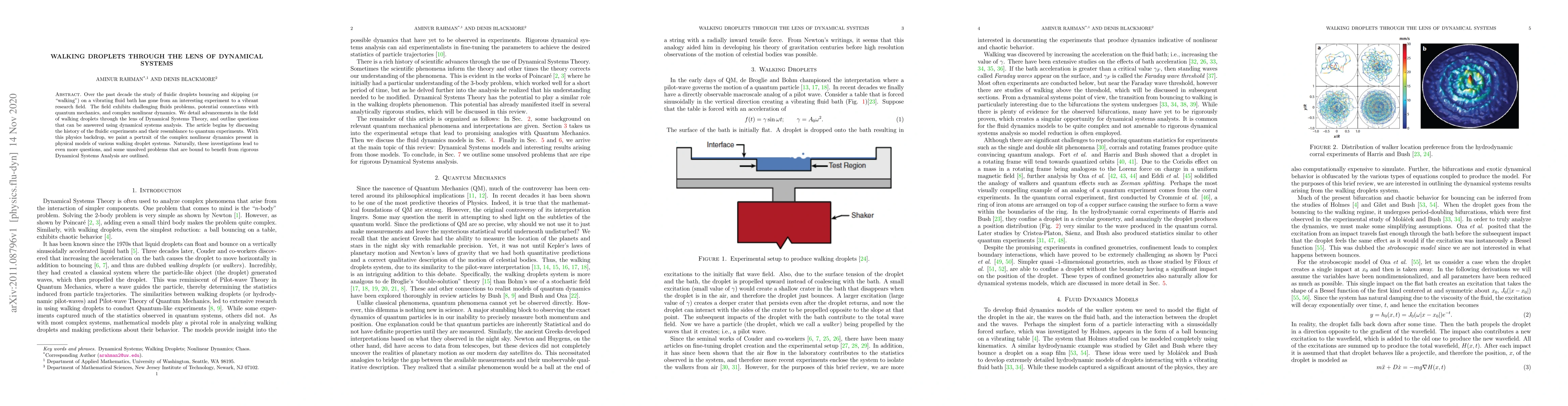 Over the past decade the study of fluidic droplets bouncing and skipping (or ``walking'') on a vibrating fluid bath has gone from an interesting experiment to a vibrant research field. The field exhibits challenging fluids problems, potential connections with quantum mechanics, and complex nonlinear dynamics. We detail advancements in the field of walking droplets through the lens of Dynamical Systems Theory, and outline questions that can be answered using dynamical systems analysis. The article begins by discussing the history of the fluidic experiments and their resemblance to quantum experiments. With this physics backdrop, we paint a portrait of the complex nonlinear dynamics present in physical models of various walking droplet systems. Naturally, these investigations lead to even more questions, and some unsolved problems that are bound to benefit from rigorous Dynamical Systems Analysis are outlined.