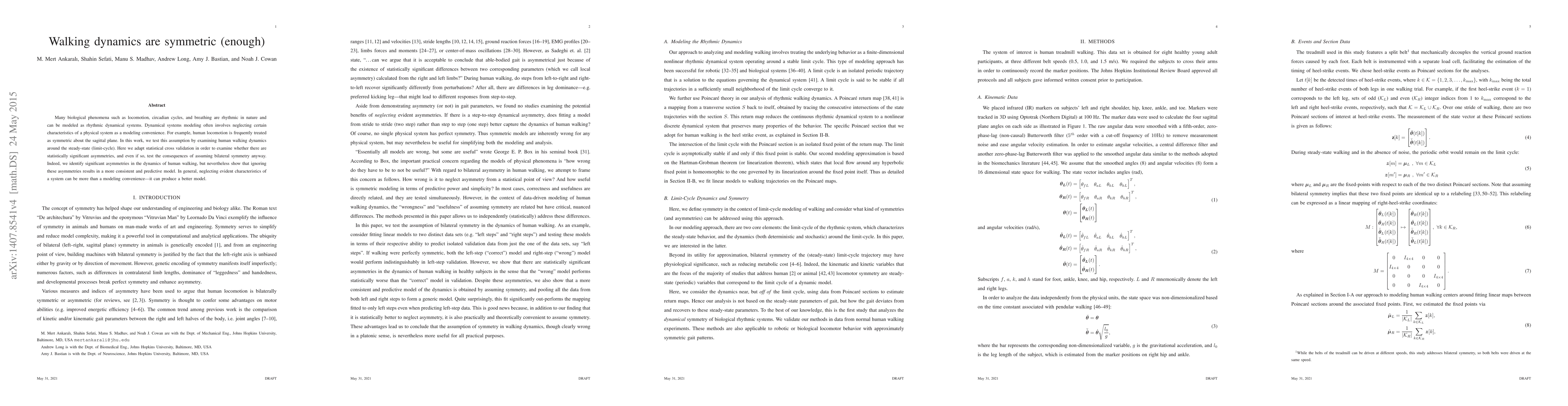 This paper examines human walking dynamics to test the assumption of symmetry about the sagittal plane, finding significant asymmetries but concluding that ignoring these asymmetries leads to a more consistent and predictive model. The study uses statistical cross validation to analyze the consequences of assuming bilateral symmetry.