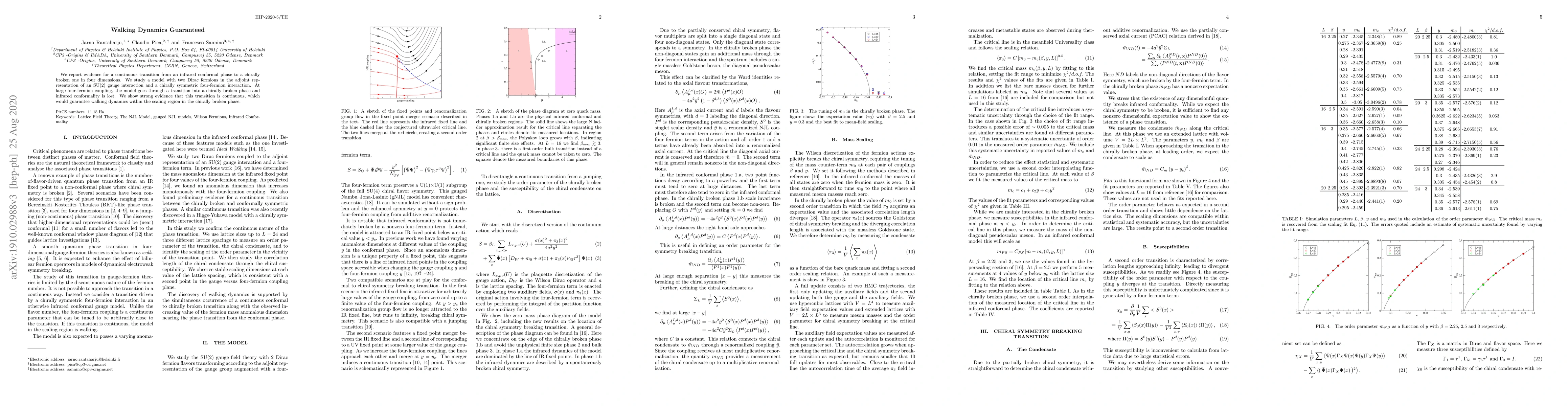 This paper investigates a transition in a four-dimensional SU(2) gauge model with two adjoint Dirac fermions and a chirally symmetric four-fermion interaction, demonstrating a continuous shift from an infrared conformal phase to a chirally broken phase, ensuring walking dynamics in the latter.