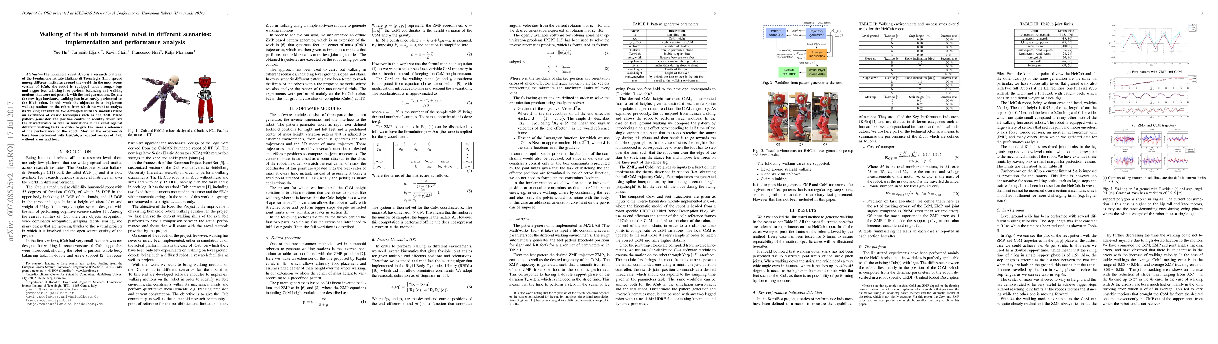 The humanoid robot iCub is a research platform of the Fondazione Istituto Italiano di Tecnologia (IIT), spread among different institutes around the world. In the most recent version of iCub, the robot is equipped with stronger legs and bigger feet, allowing it to perform balancing and walking motions that were not possible with the first generations. Despite the new legs hardware, walking has been rarely performed on the iCub robot. In this work the objective is to implement walking motions on the robot, from which we want to analyze its walking capabilities. We developed software modules based on extensions of classic techniques such as the ZMP based pattern generator and position control to identify which are the characteristics as well as limitations of the robot against different walking tasks in order to give the users a reference of the performance of the robot. Most of the experiments have been performed with HeiCub, a reduced version of iCub without arms and head.