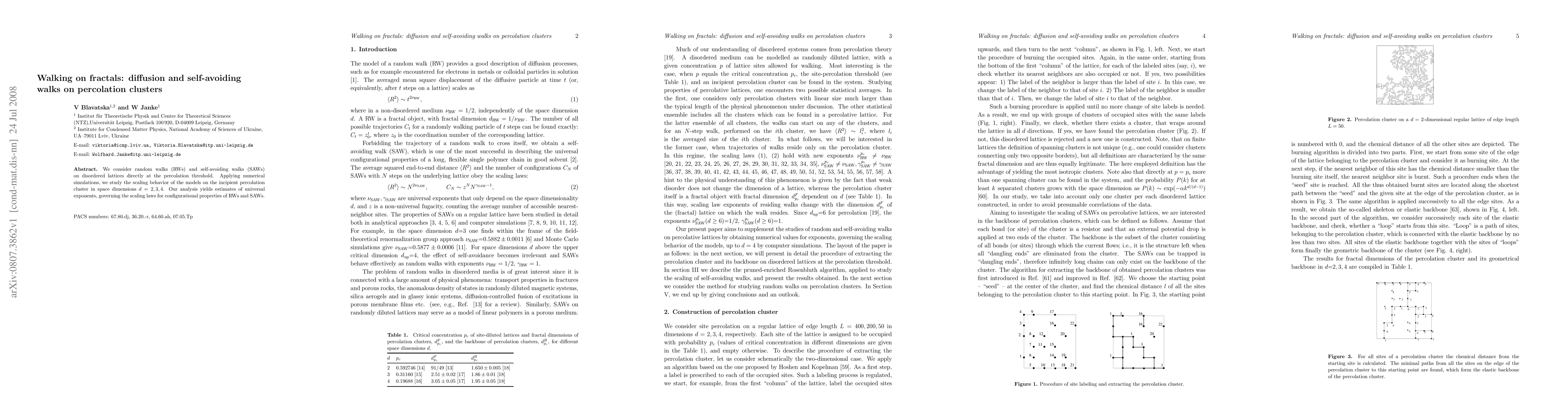 This paper investigates random and self-avoiding walks on percolation clusters at the percolation threshold using numerical simulations, focusing on scaling behavior in dimensions d=2, 3, 4, and deriving universal exponents for these scaling laws.