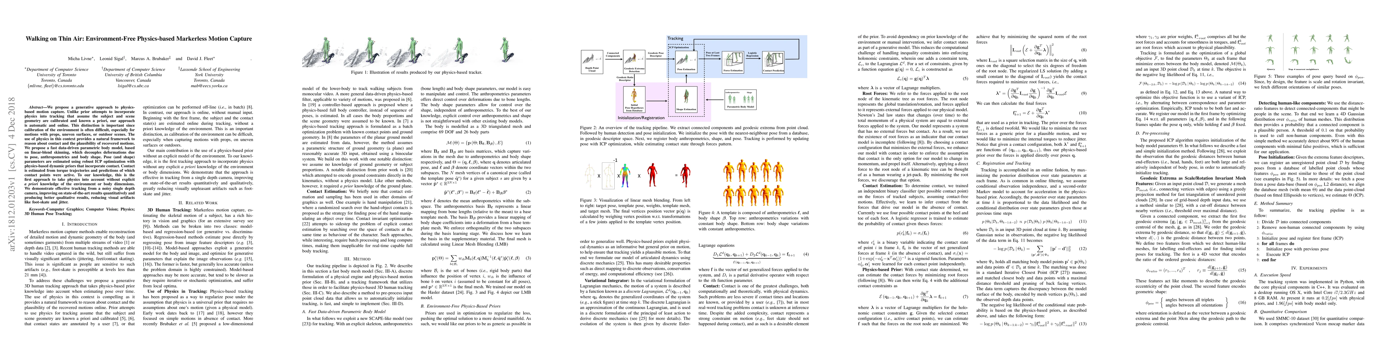 We propose a generative approach to physics-based motion capture. Unlike prior attempts to incorporate physics into tracking that assume the subject and scene geometry are calibrated and known a priori, our approach is automatic and online. This distinction is important since calibration of the environment is often difficult, especially for motions with props, uneven surfaces, or outdoor scenes. The use of physics in this context provides a natural framework to reason about contact and the plausibility of recovered motions. We propose a fast data-driven parametric body model, based on linear-blend skinning, which decouples deformations due to pose, anthropometrics and body shape. Pose (and shape) parameters are estimated using robust ICP optimization with physics-based dynamic priors that incorporate contact. Contact is estimated from torque trajectories and predictions of which contact points were active. To our knowledge, this is the first approach to take physics into account without explicit {\em a priori} knowledge of the environment or body dimensions. We demonstrate effective tracking from a noisy single depth camera, improving on state-of-the-art results quantitatively and producing better qualitative results, reducing visual artifacts like foot-skate and jitter.
