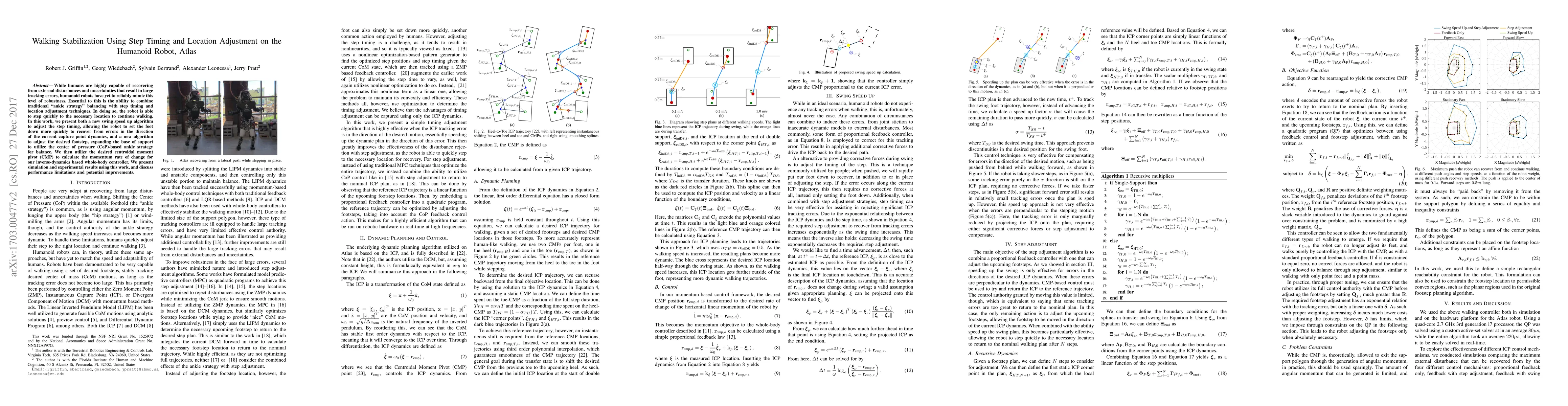 This paper introduces new algorithms for the Atlas humanoid robot to enhance walking stabilization through improved step timing and location adjustment, combining traditional ankle strategy balancing with dynamic response to disturbances. Simulation and experimental results demonstrate the effectiveness of these techniques, though limitations and future improvements are also discussed.