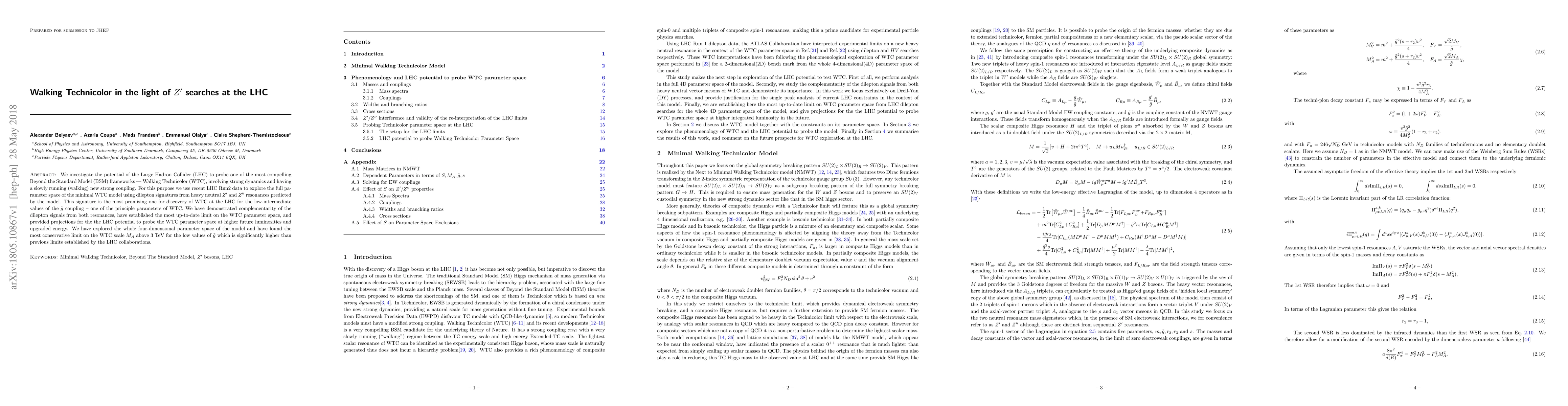 This paper explores the Large Hadron Collider's (LHC) capability to investigate Walking Technicolor, a Beyond the Standard Model framework, using dilepton signatures from $Z^{\prime}$ and $Z^{\prime\prime}$ resonances. The study establishes the most up-to-date limits on the WTC parameter space, finding a conservative limit on the WTC scale $M_A$ above 3 TeV for low values of the $\tilde g$ coupling.
