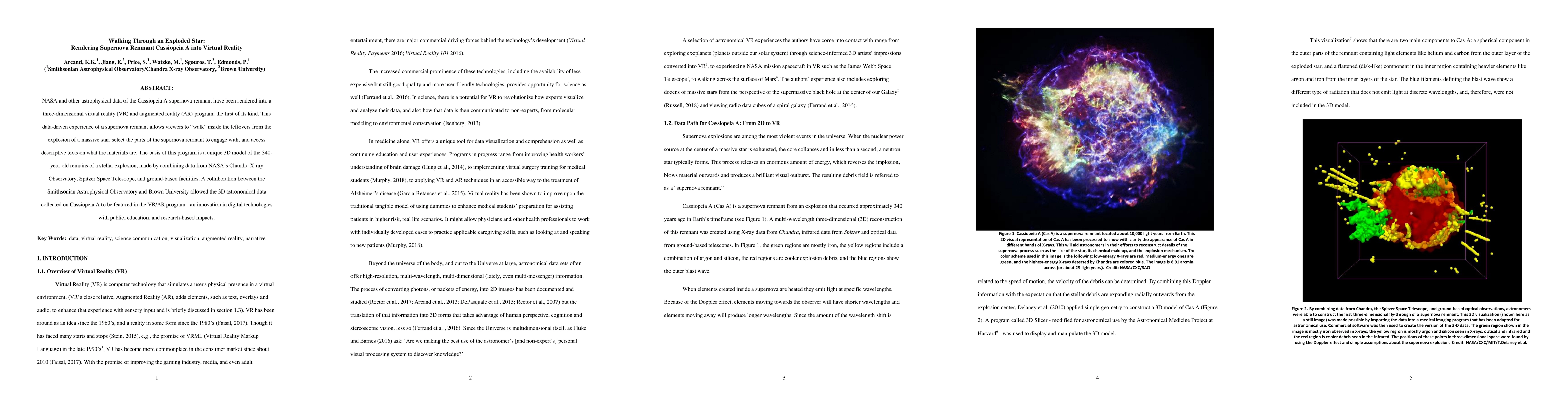 This paper details the creation of a VR/AR program that renders the Cassiopeia A supernova remnant, combining NASA data from multiple observatories to provide an immersive experience. The program allows users to explore the 3D model of the stellar explosion remnants and access detailed information about the materials involved.