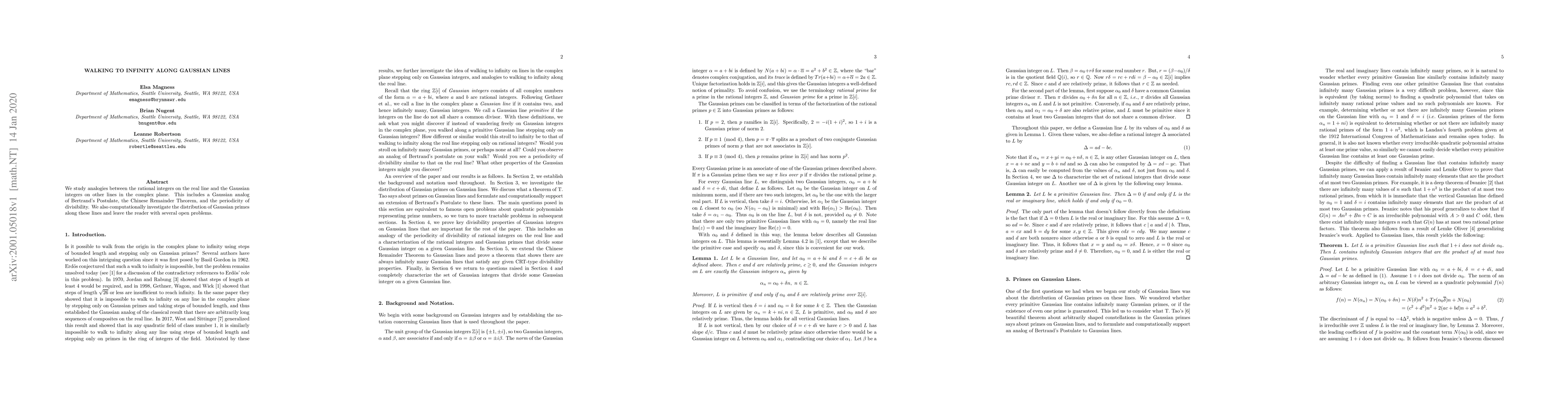 We study analogies between the rational integers on the real line and the Gaussian integers on other lines in the complex plane. This includes a Gaussian analog of Bertrands Postulate, the Chinese Remainder Theorem, and the periodicity of divisibility. We also computationally investigate the distribution of Gaussian primes along these lines and leave the reader with several open problems.