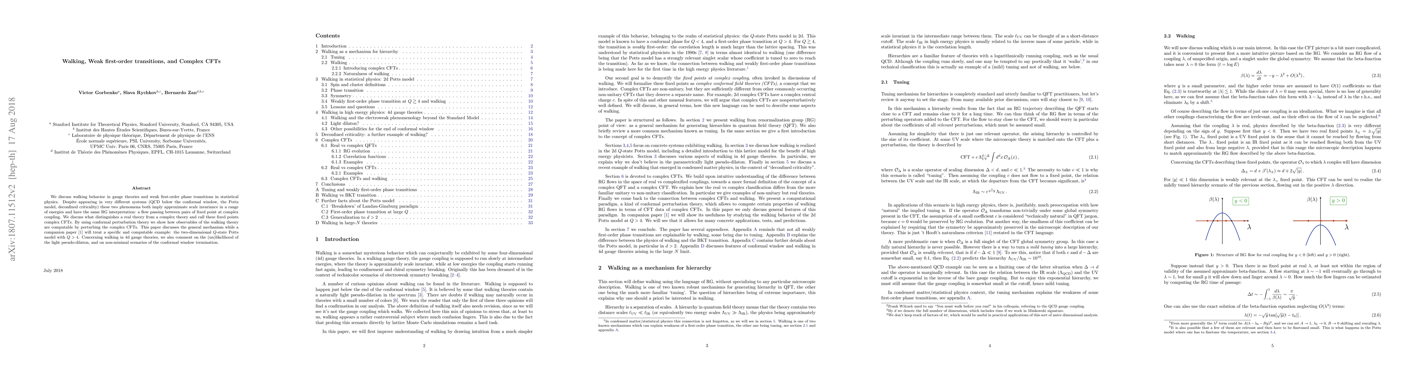 This paper explores walking behavior in gauge theories and weak first-order phase transitions, showing they both indicate approximate scale invariance and share a renormalization group interpretation involving complex fixed points (complex CFTs). It uses conformal perturbation theory to compute observables in walking theories via these complex CFTs, while a companion paper focuses on a specific example: the two-dimensional Q-state Potts model with Q > 4.