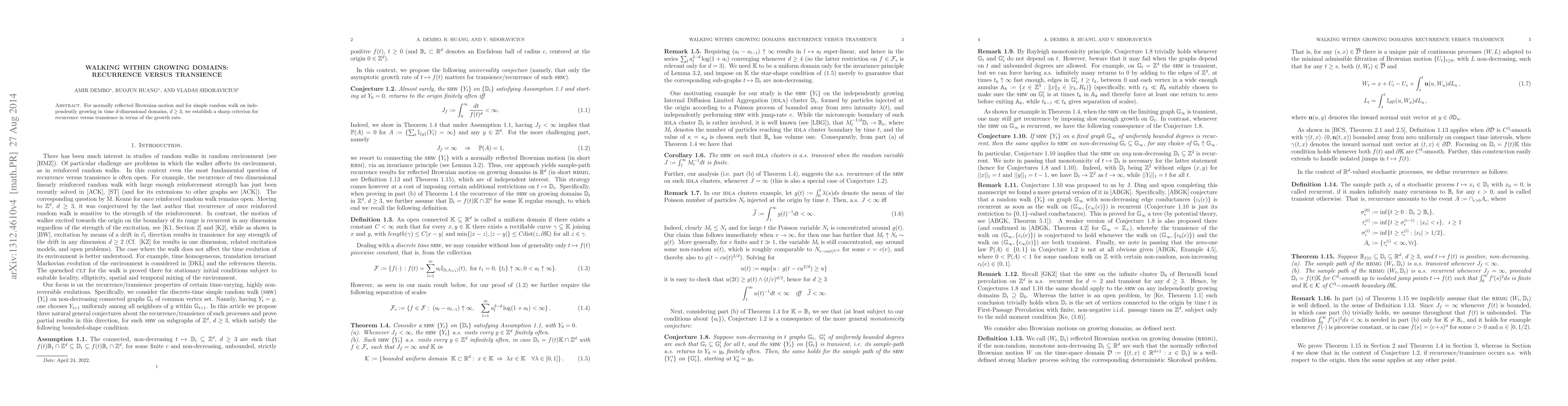 Summary: The paper establishes a precise criterion for determining whether normally reflected Brownian motion and simple random walks in growing d-dimensional domains (d>=3) will recur or be transient, based on the domains' growth rate.