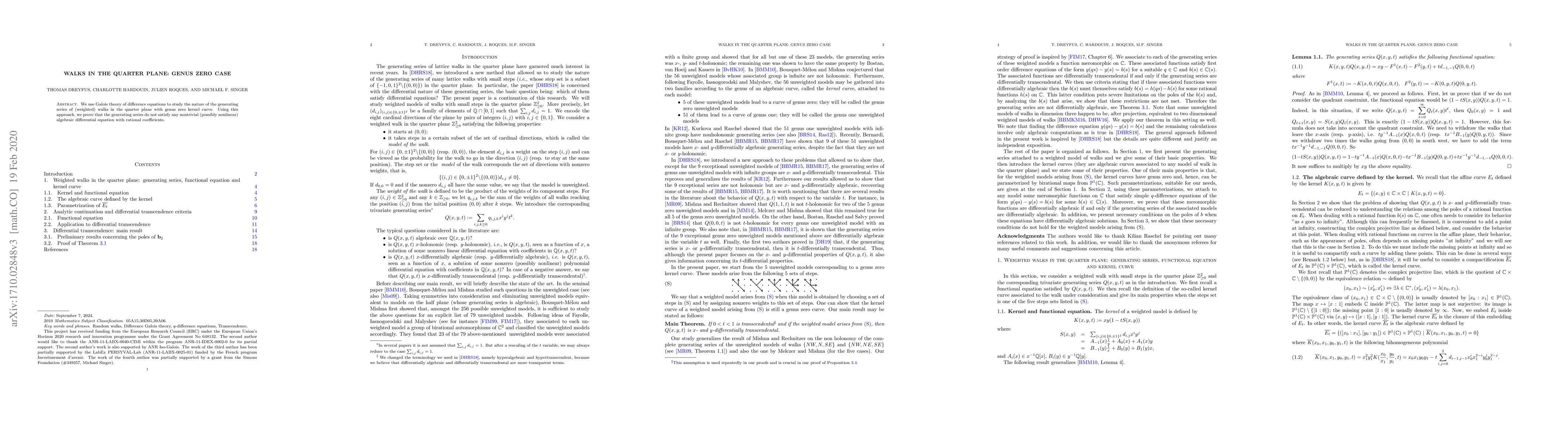 Researchers used Galois theory to study generating series of weighted walks in the quarter plane with a genus zero kernel curve, proving that these series do not satisfy any nontrivial algebraic differential equation with rational coefficients.