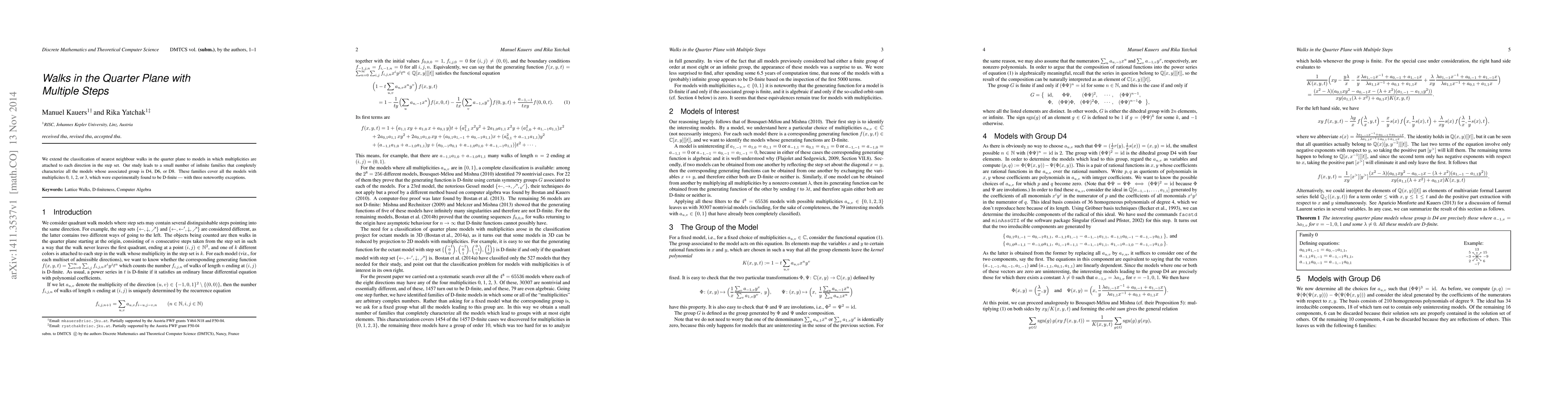 This paper classifies nearest neighbour walks in the quarter plane with multiple step directions, identifying infinite families that characterize models associated with D4, D6, or D8 groups. It finds that most models with multiplicities 0 to 3 are D-finite, except for three notable exceptions.