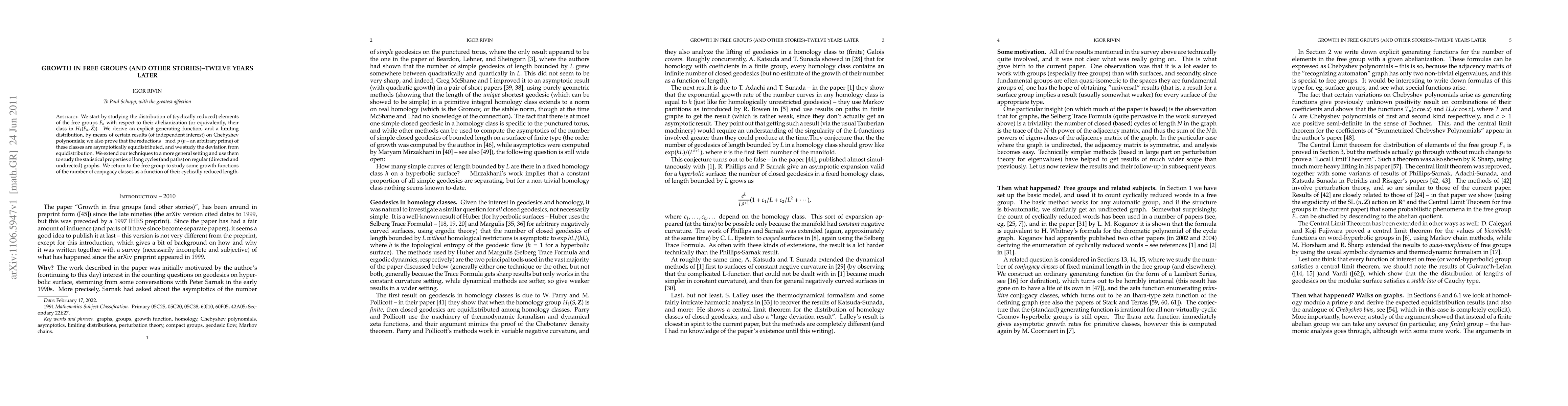 We start by studying the distribution of (cyclically reduced) elements of the free groups Fn with respect to their abelianization (or equivalently, their integer homology class. We derive an explicit generating function, and a limiting distribution, by means of certain results (of independent interest) on Chebyshev polynomials; we also prove that the reductions modulo an arbitrary prime of these classes are asymptotically equidistributed, and we study the deviation from equidistribution. We extend our techniques to a more general setting and use them to study the statistical properties of long cycles (and paths) on regular (directed and undirected) graphs. We return to the free group to study some growth functions of the number of conjugacy classes as a function of their cyclically reduced length.