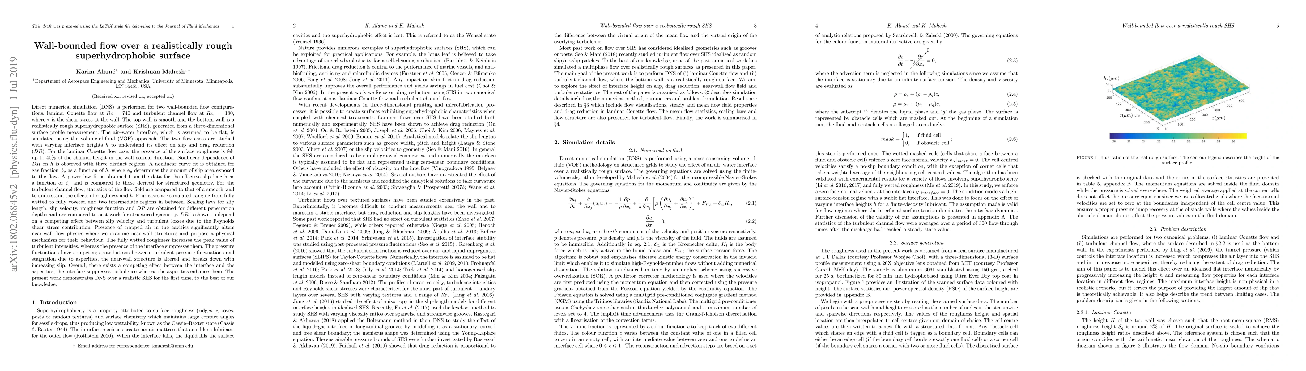 This research uses DNS to study wall-bounded flow over a realistically rough superhydrophobic surface in both laminar Couette and turbulent channel flows. The presence of a superhydrophobic surface with trapped air reduces drag and alters flow behavior, with a nonlinear dependence on interface height. In turbulent flow, the interface suppresses turbulence while the roughness enhances it, creating a competing effect.